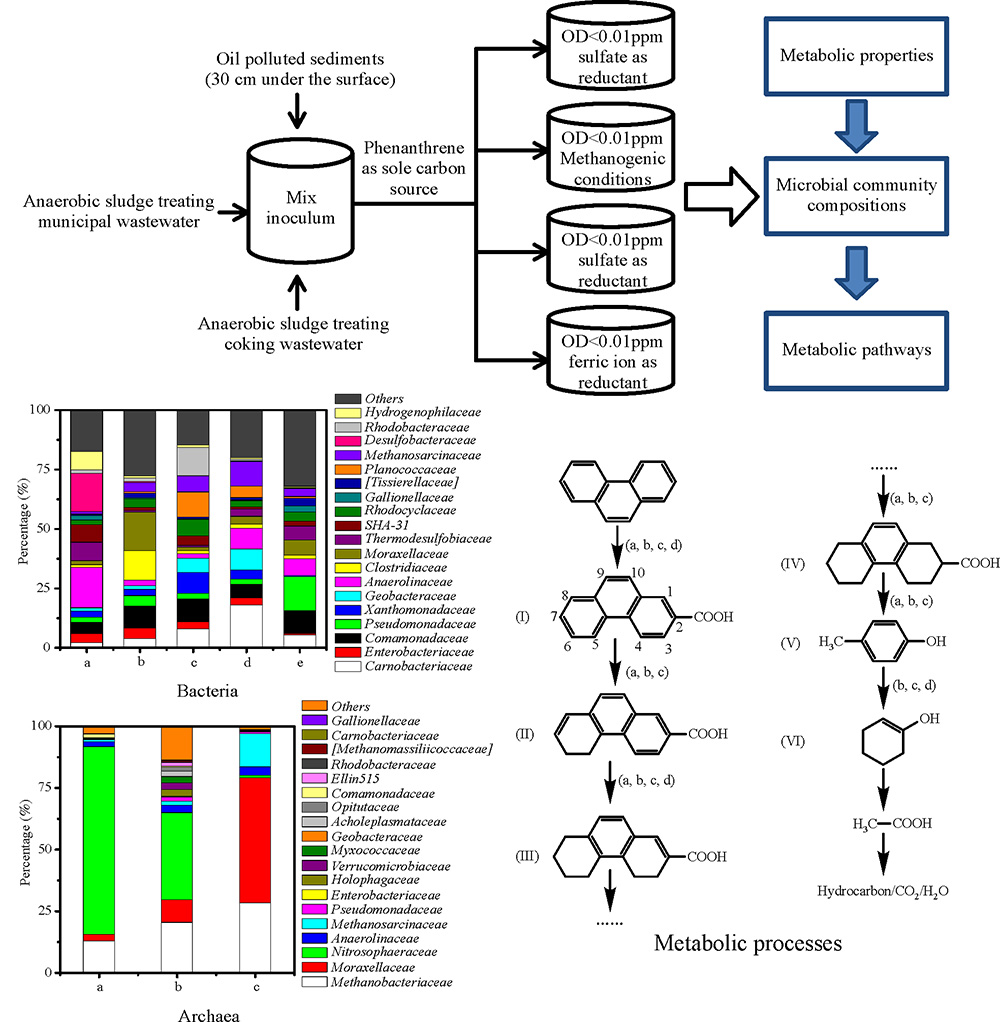 Anaerobic phenanthrene biodegradation enriched process was described in detail. The enriched bacterial communities were characterized under four redox conditions. The enriched archaeal communities were stated under high percentage conditions. Relatively intact pathways of anaerobic phenanthrene biodegradation were proposed.