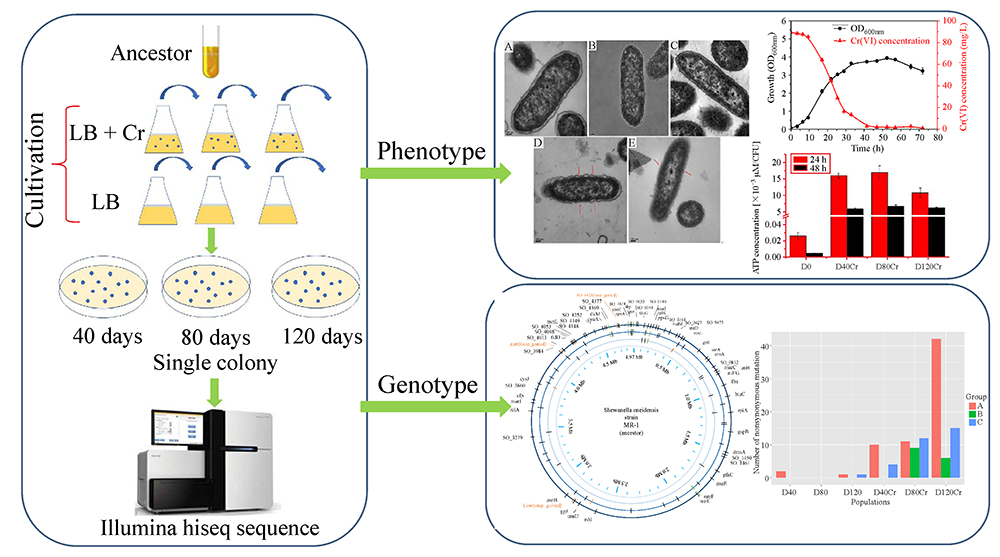 Acclimation is the main method to enhance the productivity of microorganisms in environmental biotechnology, but it remains uncertain how microorganisms acquire resistance to high concentrations of pollutants during long-term acclimation. Shewanella oneidensis MR-1 was acclimated for 120 days with increasing hexavalent chromium (Cr(VI)) concentrations from 10 to 190 mg/L. The bacterium was able to survive from the highly toxic Cr(VI) environment due to its enhanced capability to reduce Cr(VI) and the increased cell membrane surface. We sequenced 19 complete genomes from 7 populations of MR-1, including the ancestral strain, the evolved strains in Cr(VI) environment on days 40, 80 and 120 and their corresponding controls. A total of 27, 49 and 90 single nucleotide polymorphisms were found in the Cr(VI)-evolved populations on days 40, 80 and 120, respectively. Nonsynonymous substitutions were clustered according to gene functions, and the gene mutations related to integral components of the membrane, including efflux pumps and transporters, were the key determinants of chromate resistance. In addition, MR-1 strengthened the detoxification of Cr(VI) through gene variations involved in adenosine triphosphate binding, electron carrier activity, signal transduction and DNA repair. Our results provide an in-depth analysis of how Cr(VI) resistance of S. oneidensis MR-1 is improved by acclimation, as well as a genetic understanding of the impact of long-term exposure of microorganisms to pollution.