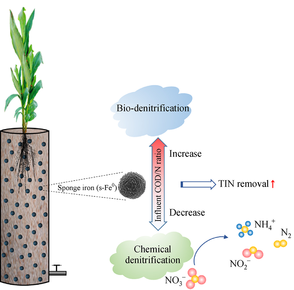Sponge iron (s-Fe0) is a porous metal with the potential to be an electron donor for denitrification. This study aims to evaluate the feasibility of using s-Fe0 as the substrate of wetland mesocosms. Here, wetland mesocosms with the addition of s-Fe0 particles (CW-Fe) and a blank control group (CW-CK) were established. The NO3‒-N reduction property and water quality parameters (pH, DO, and ORP) were examined at three COD/N ratios (0, 5, and 10). Results showed that the NO3‒-N removal efficiencies were significantly increased by 6.6 to 58.9% in the presence of s-Fe0. NH4+-N was mainly produced by chemical denitrification, and approximately 50% of the NO3‒-N was reduced to NH4+-N, at the COD/ratio of 0. An increase of the influent COD/N ratio resulted in lower chemical denitrification and higher bio-denitrification. Although chemical denitrification mediated by s-Fe0 led to an accumulation of NH4+-N at COD/N ratios of 0 and 5, the TIN removal efficiencies increased by 4.5%‒12.4%. Moreover, the effluent pH, DO, and ORP values showed a significant negative correlation with total Fe and Fe (II) (P<0.01). High-throughput sequencing analysis indicated that Trichococcus (77.2%) was the most abundant microorganism in the CW-Fe mesocosm, while Thauera, Zoogloea, and Herbaspirillum were the primary denitrifying bacteria. The denitrifiers, Simplicispira, Dechloromonas, and Denitratisoma, were the dominant bacteria for CW-CK. This study provides a valuable method and an improved understanding of NO3‒-N reduction characteristics of s-Fe0 in a wetland mesocosm.