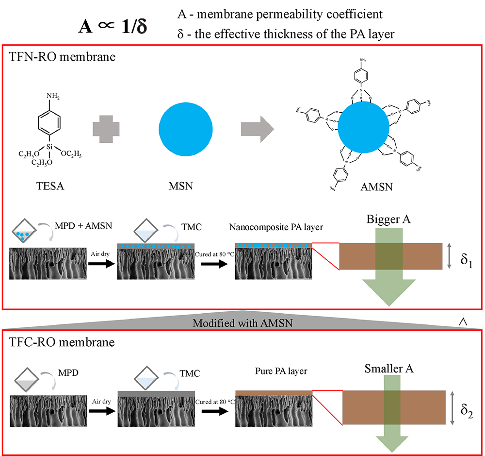 Mesoporous silica nanoparticles (MSN), with higher water permeability than NaA zeolite, were used to fabricate thin-film nanocomposite (TFN) reverse osmosis (RO) membranes. However, only aminoalkyl-modified MSN and low-pressure (less than 2.1 MPa) RO membrane were investigated. In this study, aminophenyl-modified MSN (AMSN) were synthesized and used to fabricate high-pressure (5.52 MPa) RO membranes. With the increasing of AMSN dosage, the crosslinking degree of the aromatic polyamide decreased, while the hydrophilicity of the membranes increased. The membrane morphology was maintained to show a ridge-and-valley structure, with only a slight increase in membrane surface roughness. At the optimum conditions (AMSN dosage of 0.25 g/L), when compared with the pure polyamide RO membrane, the water flux of the TFN RO membrane (55.67 L/m2/h) was increased by about 21.6%, while NaCl rejection (98.97%) was slightly decreased by only 0.29%. However, the water flux of the membranes was much lower than expected. We considered that the enhancement of RO membrane permeability is attributed to the reduction of the effective thickness of the PA layer.