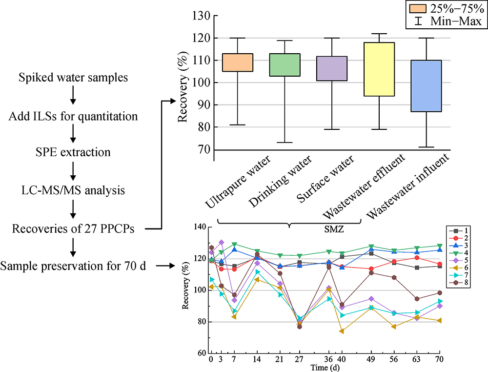 Pharmaceuticals and personal care products (PPCPs) are a unique group of emerging and non-persistent contaminants. In this study, 27 PPCPs in various water samples were extracted by solid phase extraction (SPE), and determined by isotope dilution method using liquid chromatography coupled to tandem triple quadruple mass spectrometer (LC-MS/MS). A total of 27 isotopically labeled standards (ILSs) were applied to correct the concentration of PPCPs in spiked ultrapure water, drinking water, river, effluent and influent sewage. The corrected recoveries were 73%–122% with the relative standard deviation (RSD)<16%, except for acetaminophen. The matrix effect for all kinds of water samples was<22% and the method quantitation limits (MQLs) were 0.45–8.6 ng/L. The developed method was successfully applied on environmental water samples. The SPE extracts of spiked ultrapure water, drinking water, river and wastewater effluent were stored for 70 days, and the ILSs-corrected recoveries of 27 PPCPs were obtained to evaluate the correction ability of ILSs in the presence of variety interferences. The recoveries of 27 PPCPs over 70 days were within the scope of 72%–140% with the recovery variation<37% in all cases. The isotope dilution method seems to be of benefit when the extract has to be stored for long time before the instrument analysis.