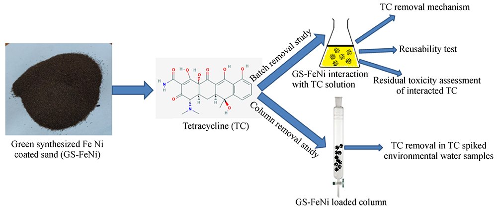 In this study, FeNi nanoparticles were green synthesized using Punica granatum (pomegranate) peel extract, and these nanoparticles were also formed in situ over quartz sand (GS-FeNi) for removal of tetracycline (TC). Under the optimized operating conditions, (GS-FeNi concentration: 1.5% w/v; concentration of TC: 20 mg/L; interaction period: 180 min), 99±0.2% TC removal was achieved in the batch reactor. The removal capacity was 181±1 mg/g. A detailed characterization of the sorbent and the solution before and after the interaction revealed that the removal mechanism(s) involved both the sorption and degradation of TC. The reusability of reactant was assessed for four cycles of operation, and 77±4% of TC removal was obtained in the cycle. To judge the environmental sustainability of the process, residual toxicity assay of the interacted TC solution was performed with indicator bacteria (Bacillus and Pseudomonas) and algae (Chlorella sp.), which confirmed a substantial decrease in the toxicity. The continuous column studies were undertaken in the packed bed reactors using GS-FeNi. Employing the optimized conditions, quite high removal efficiency (978±5 mg/g) was obtained in the columns. The application of GS-FeNi for antibiotic removal was further evaluated in lake water, tap water, and ground water spiked with TC, and the removal capacity achieved was found to be 781±5, 712±5, and 687±3 mg/g, respectively. This work can pave the way for treatment of antibiotics and other pollutants in the reactors using novel green composites prepared from fruit wastes.