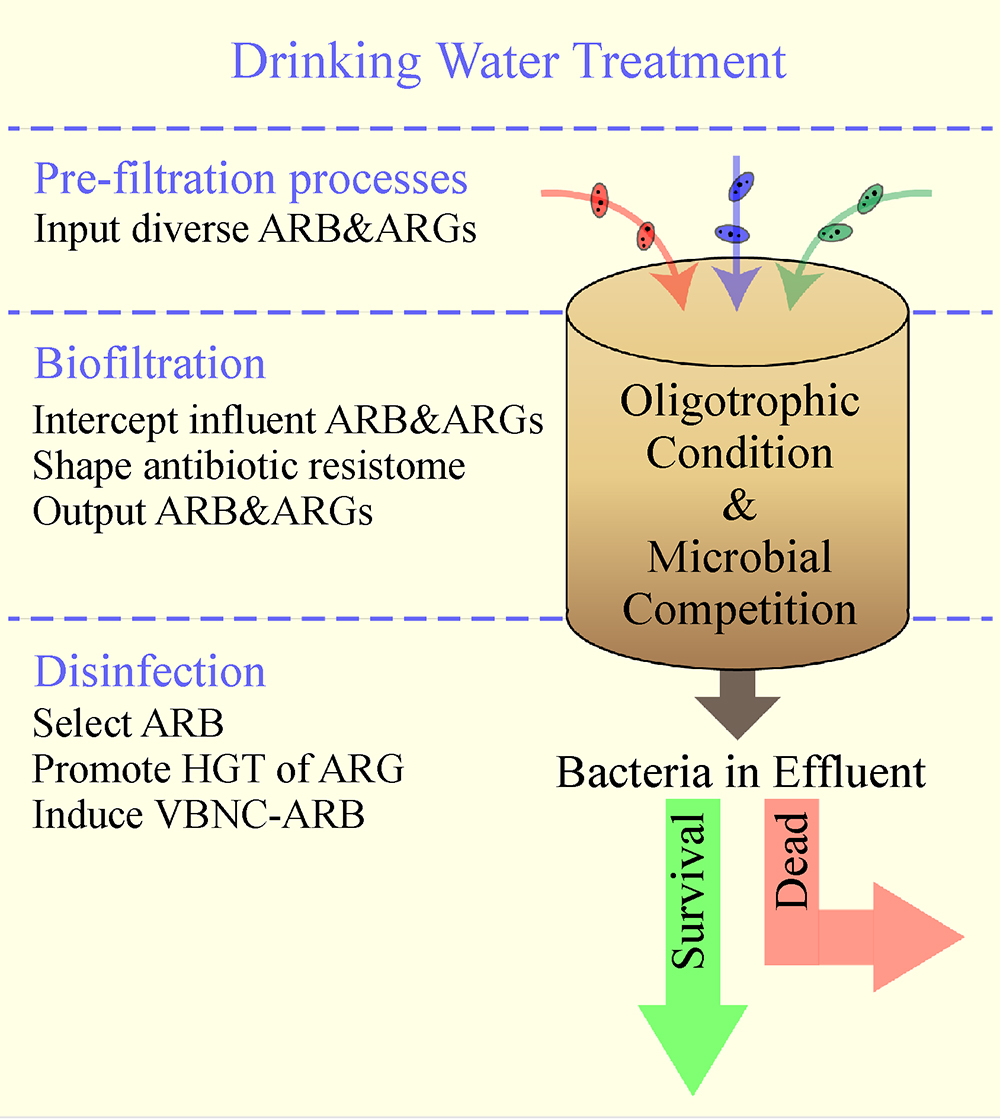 The bacterial antibiotic resistome (BAR) is one of the most serious contemporary medical challenges. The BAR problem in drinking water is receiving growing attention. In this study, we focused on the distribution, changes, and health risks of the BAR throughout the drinking water treatment system. We extracted the antibiotic resistance gene (ARG) data from recent publications and analyzed ARG profiles based on diversity, absolute abundance, and relative abundance. The absolute abundance of ARG was found to decrease with water treatment processes and was positively correlated with the abundance of 16S rRNA (r2 = 0.963, p<0.001), indicating that the reduction of ARG concentration was accompanied by decreasing biomass. Among treatment processes, biofiltration and chlorination were discovered to play important roles in shaping the bacterial antibiotic resistome. Chlorination exhibited positive effects in controlling the diversity of ARG, while biofiltration, especially granular activated carbon filtration, increased the diversity of ARG. Both biofiltration and chlorination altered the structure of the resistome by affecting relative ARG abundance. In addition, we analyzed the mechanism behind the impact of biofiltration and chlorination on the bacterial antibiotic resistome. By intercepting influent ARG-carrying bacteria, biofilters can enrich various ARGs and maintain ARGs in biofilm. Chlorination further selects bacteria co-resistant to chlorine and antibiotics. Finally, we proposed the BAR health risks caused by biofiltration and chlorination in water treatment. To reduce potential BAR risk in drinking water, membrane filtration technology and water boiling are recommended at the point of use.