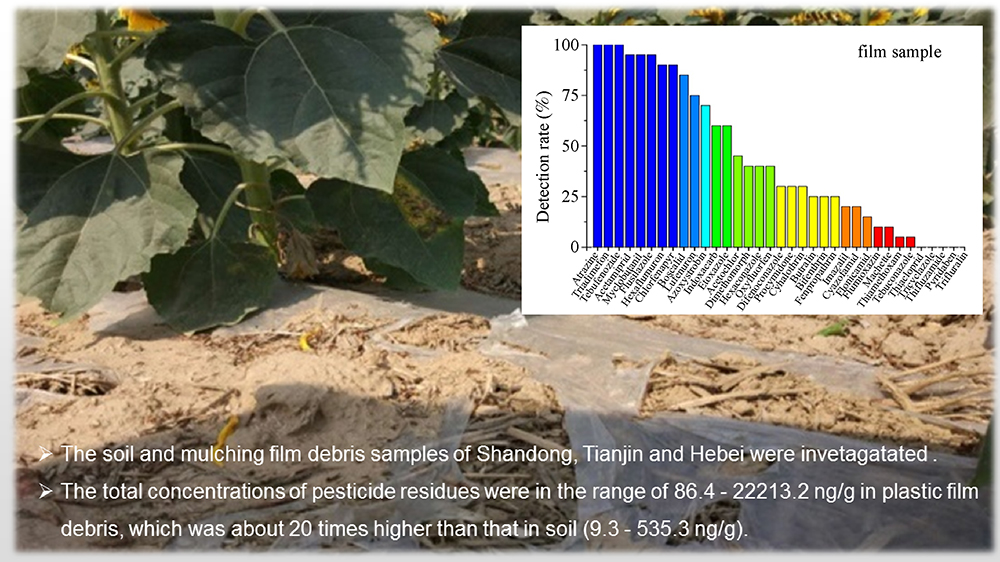 Plastic debris as new pollutants attracts much attention in the recent years. The plastic mulching films is one of the most important plastic debirs source in the environment. The aim of this work was to investigate the current status of pesticide residues on the plastic mulching films. Based on the QuEChERS method, multi-residue methods for detection of pesticide residues with gas chromatography tandem mass spectrum (GC-MS) and high performance liquid chromatography tandem mass spectrum (HPLC-MS) were developed for the analysis of the pesticides residues in plastic film and soil samples from Tianjin, Hebei and Shandong. The total concentrations of pesticide residues were in the range of 86.4‒22213.2 ng/g in plastic film debris, which was about 20 times higher than that in soil (9.3‒535.3 ng/g). Residual level of pesticides varied greatly in different samples. The historical usage and recent application of pesticides were the main sources for pesticide residues on plastic films and soil. In short, plastic mulching films could act as a sink for pesticides in farmland and the ubiquitous pesticide residues on plastic films should draw more attention.