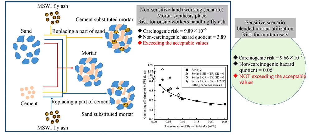 • Washed MSWI fly ash was used as partial cement or sand substitute. • Sand replacing is beneficial for strength, while cement replacement reduces strength. • Cementing efficiency factor and mortar pore structure explain the strength results. • Health risk assessment was conducted for MSWI fly ash blended cement mortar. • CR and HI contributed by different exposures and heavy metals were analyzed.