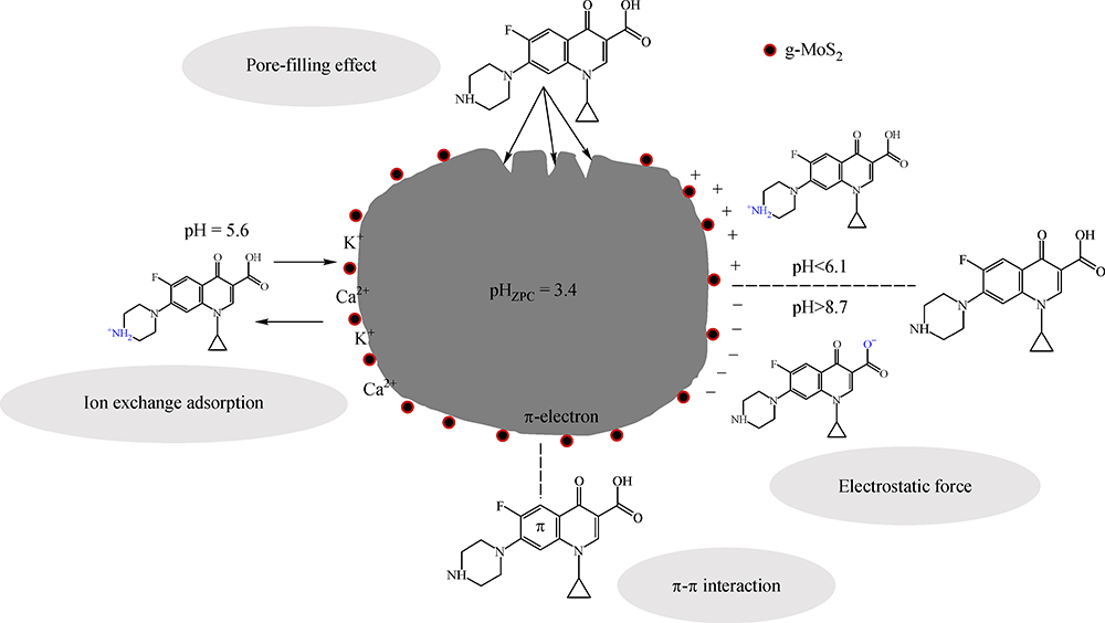 The g-MoS2 coated biochar (g-MoS2-BC) composites were synthesized by coating original biochar with g-MoS2 nanosheets at 300°C(BC300)/700°C (BC700). The adsorption properties of the g-MoS2-BC composites for ciprofloxacin (CIP) were investigated with an aim to exploit its high efficiency toward soil amendment. The specific surface area and the pore structures of biochar coated g-MoS2 nanosheets were significantly increased. The g-MoS2-BC composites provided more π electrons, which was favorable in enhancing the π-π electron donor-acceptor (EDA) interactions between CIP and biochar. As a result, the g-MoS2-BC composites showed faster adsorption rate and greater adsorption capacity for CIP than the original biochar. The coated g-MoS2 nanosheets contributed more to CIP adsorption on the g-MoS2-BC composites due to their greater CIP adsorption capacity than the original biochar. Moreover, the synergistic effect was observed for CIP adsorption on g-MoS2-BC700, and suppression effect on g-MoS2-BC300. In addition, the adsorption of CIP onto g-MoS2-BC composites also exhibited strong dependence on the solution pH, since it can affect both the adsorbent surface charge and the speciation of contaminants. It was reasonably suggested that the mechanisms of CIP adsorption on g-MoS2-BC composites involved pore-filling effects, π-π EDA interaction, electrostatic interaction, and ion exchange interaction. These results are useful for the modification of biochar in exploiting the novel amendment for contaminated soils.