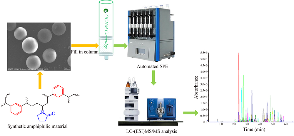 In this study, a hydrophilic resin named GCHM was fabricated based on poly(N-vinyl pyrrolidone-co-divinylbenzene), characterized, and applied as a solid-phase extraction (SPE) material. Up to 44 pharmaceuticals and personal care products (PPCPs) belonging to 10 classes were recovered in environmental water samples. Different variables affecting extraction, such as adsorbent amount, sample pH, and loading speed, were optimized. Under optimal conditions, the average absolute recovery of 44 PPCPs was 75.6% using GCHM, indicating a better performance than the commercial Oasis® HLB. SPE with home-made hydrophilic polymeric sorbent followed by ultra-performance liquid chromatography and tandem mass spectrometry was validated, and the method achieved good linearity (r2>0.991, for all analytes). In addition, the method detection limits of target compounds ranged from 0.03 to 0.6 ng/L. The developed method was applied to determine PPCPs in 10 environmental water samples taken from the Yangtze River, Huaihe River, and Taihu Lake, 1 groundwater sample from Changzhou in Jiangsu Province, 1 wastewater sample from Xiamen and 2 seawater samples from the Jiulong River in Fujian Province, China. In these samples, 22 compounds were determined at levels ranging from 0.5 to 1590 ng/L.