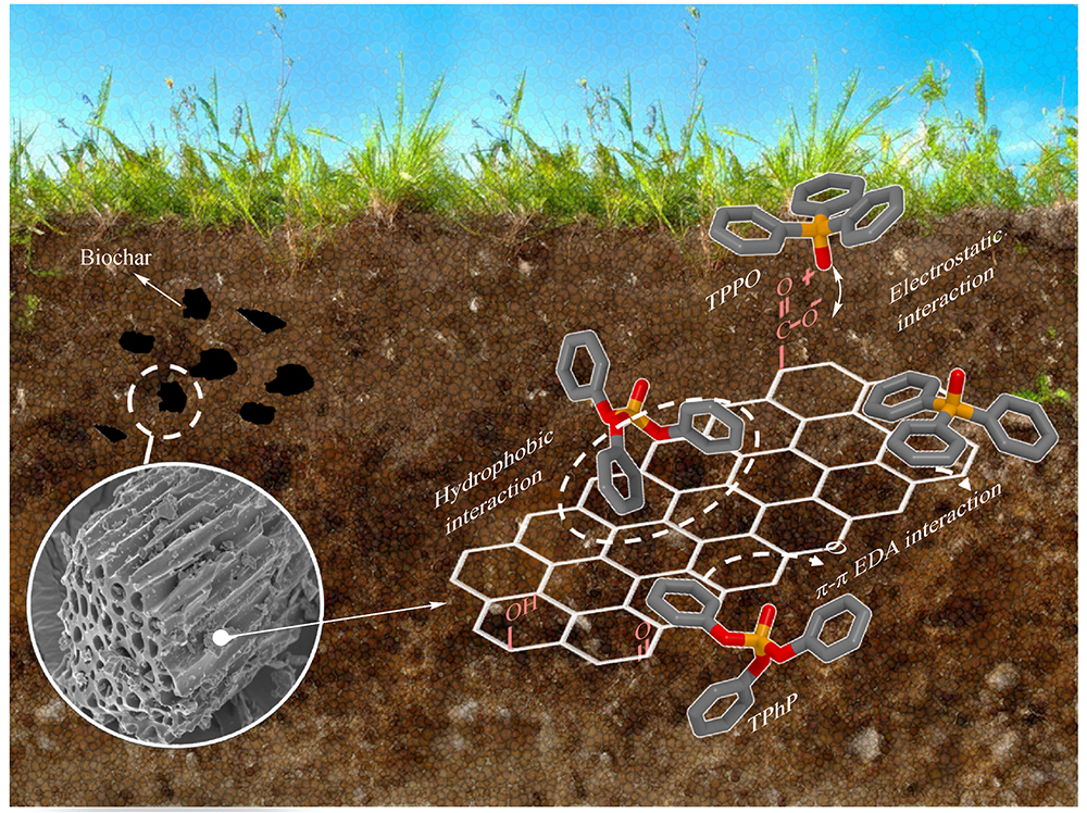 Aromatic organophosphate flame retardant (OPFR) pollutants and biochars are commonly present and continually released into soils due to their increasingly wide applications. In this study, for the first time, the sorption of OPFRs on biochars was investigated. Although triphenyl phosphate (TPhP) and triphenylphosphine oxide (TPPO) have similar molecular structures and sizes, TPhP exhibited much faster and higher sorption than TPPO due to its stronger hydrophobicity, suggesting the dominant role of hydrophobic interactions in TPhP sorption. The π-π electron donor–acceptor (EDA) interactions also contributed to the sorption process, as suggested by the negative correlation between the sorption capacity of the aromatic OPFRs and the aromatic index (H/C atomic ratios) of biochar. Density functional theory calculations further showed that one benzene ring of aromatic OPFRs has no electrons, which may interact with biochar via π-π EDA interactions. The electrostatic attraction between the protonated P = O in OPFRs and the negatively charged biochar was found to occur at pH below 7. This work provides insights into the sorption behaviors and mechanisms of aromatic OPFRs by biochars.
