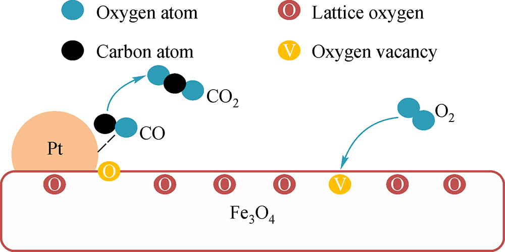 The self-inhibition behavior due to CO poisoning on Pt metal particles strongly impairs the performance of CO oxidation. It is an effective method to use reducible metal oxides for supporting Pt metal particles to avoid self-inhibition and to improve catalytic performance. In this work, we used in situ reductions of chloroplatinic acid on commercial Fe3O4 powder to prepare heterogeneous-structured Pt/Fe3O4 catalysts in the solution of ethylene glycol. The heterogeneous Pt/Fe3O4 catalysts achieved a better catalytic performance of CO oxidation compared with the Fe3O4 powder. The temperatures of 50% and 90% CO conversion were achieved above 260°C and 290°C at Pt/Fe3O4, respectively. However, they are accomplished on Fe3O4 at temperatures higher than 310°C. XRD, XPS, and H2-TPR results confirmed that the metallic Pt atoms have a strong synergistic interaction with the Fe3O4 supports. TGA results and transient DRIFTS results proved that the Pt metal particles facilitate the release of lattice oxygen and the formation of oxygen vacancies on Fe3O4. The combined results of O2-TPD and DRIFTS indicated that the activation step of oxygen molecules at surface oxygen vacancies could potentially be the rate-determining step of the catalytic CO oxidation at Pt/Fe3O4 catalysts. The reaction pathway involves a Pt-assisted Mars-van Krevelen (MvK) mechanism.