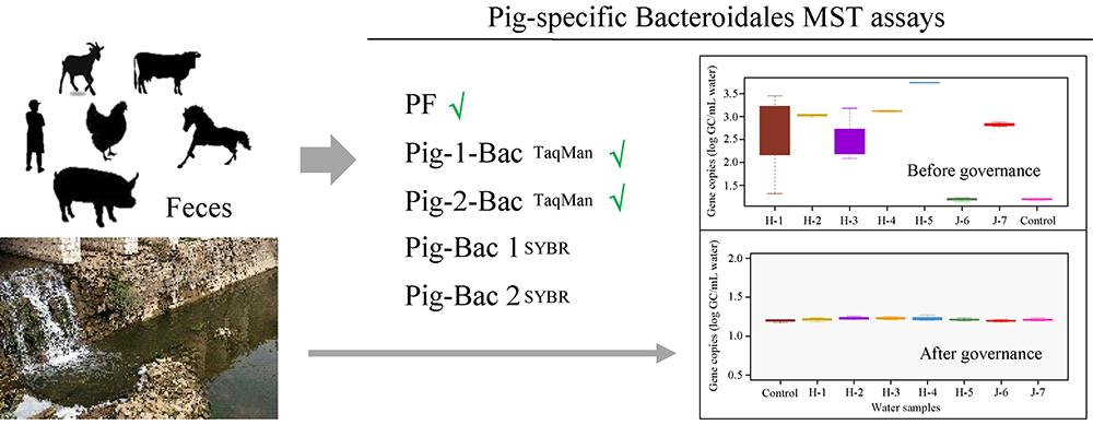 In China, pig feces is the predominant source of excrement produced by animal husbandry. Improper use or direct discharge of pig feces can result in contamination of natural water systems. Microbial source tracking (MST) technology can identify the sources of fecal pollution in environmental water, and contribute to the management of pig fecal pollution by local environmental protection agencies. However, the accuracy of such assays can be context-dependent, and they have not been comprehensively evaluated under Chinese conditions. We aimed to compare the performance of five previously reported pig-specific MST assays (PF, Pig-Bac1SYBR, Pig-Bac2SYBR, Pig-1-BacTaqMan, and Pig-2-BacTaqMan, which are based on Bacteroidales 16S rRNA gene markers) and apply them in two rivers of North China. We collected a total of 173 fecal samples from pigs, cows, goats, chickens, humans, and horses across China. The PF assay optimized in this study showed outstanding qualitative performance and achieved 100% specificity and sensitivity. However, the two SYBR green qPCR assays (Pig-Bac1SYBR and Pig-Bac2SYBR) cross-reacted with most non-pig fecal samples. In contrast, both the Pig-1-BacTaqMan and Pig-2-BacTaqMan assays gave 100% specificity and sensitivity. Of these, the Pig-2-BacTaqMan assay showed higher reproducibility. Our results regarding the specificity of these pig-specific MST assays differ from those reported in Thailand, Japan, and America. Using the PF and Pig-2-BacTaqMan assays, a field test comparing the levels of pig fecal pollution in rivers near a pig farm before and after comprehensive environmental pollution governance indicated that pig fecal pollution was effectively controlled at this location.