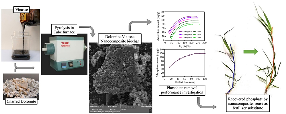 The effectiveness of phosphate (P) removal from aqueous solutions was investigated by novel low-cost biochars synthesized from vinasse and functionalized with calcined dolomite. The vinasse-derived biochar, synthesized via pyrolysis at different temperatures, showed easy preparation and a large surface area. The novel vinasse biochar nanocomposites were prepared by adding dolomite to the vinasse biochars with different weight percentages (10, 20 and 30%). The characteristics of the prepared materials were identified for further understanding of the inherent adsorption mechanism between P ions and vinasse biochars. Vinasse-dolomite nanocomposite was very effective in the adsorption of P species from aqueous media. The effect of the operational factors on Vinasse-dolomite nanocomposite was explored by applying response surface methodology (RSM). According to RSM results, the optimum condition was achieved to be contact time 90 (min), 250 (mg/L) of P concentration and pH 7. Thermodynamic isotherm and kinetic studies were applied on experimental data to understand the adsorption behavior. The Vinasse-dolomite nanocomposite revealed preferential P species adsorption in the presence of co-existing anions. The P species could be recovered by 1.0 M HCl where the efficiency was not affected up to the fifth cycle. The P-loaded Vinasse-dolomite nanocomposite was successfully tested on a plant; it significantly improved its growth and proved its potency as a P-based fertilizer substitute.