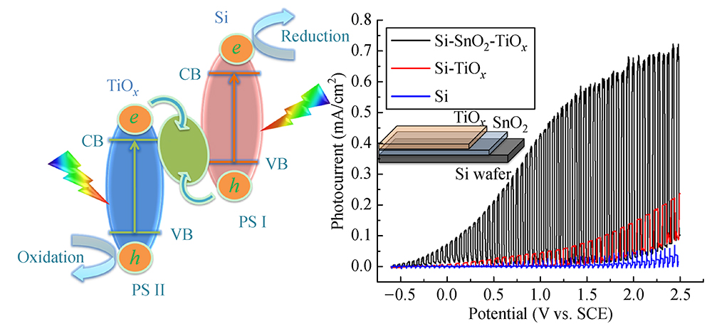 • A novel Z-scheme Si-SnO2-TiOx with SnO2 as electron mediator is first constructed. • Transparent and conductive SnO2 can pass light through and promote charge transport. • VO from SnO2 and TiOx improve photoelectrochemical performances. • Efficient photocatalytic degradations originate from the Z scheme construction.