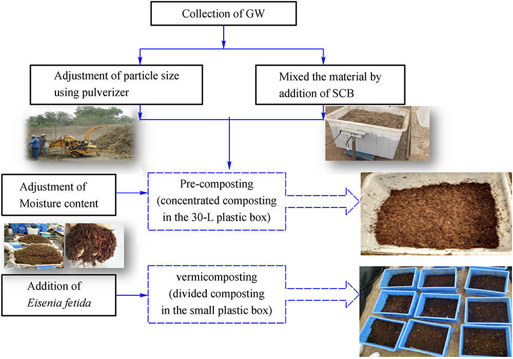 •Earthworms were able to convert green waste into more plant-available nutrients. •The part of heavy metals content increased in the compost added by earthworm. •The addition of SCB to GW did enhance earthworm biomass and humic acid content. •The resulting vermicomposts were characterized by neutral pH and lower EC value.