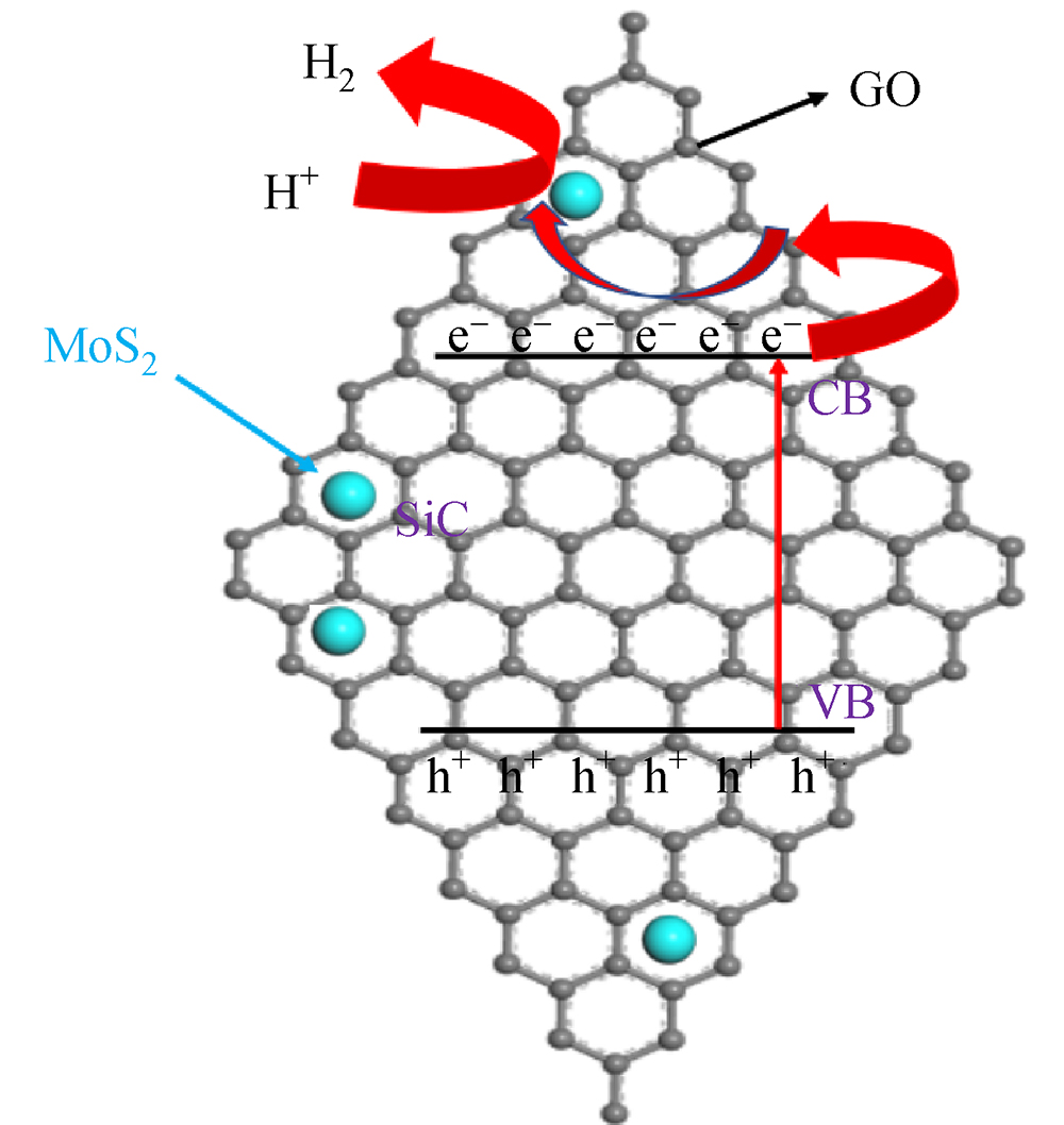 •The MoS2/SiC/GO composite has a strong photocatalytic activity than SiC. •The optimal catalyst yielded the highest quantum of 21.69%. •GO acts as a bridge for electron passage in photocatalytic reaction.