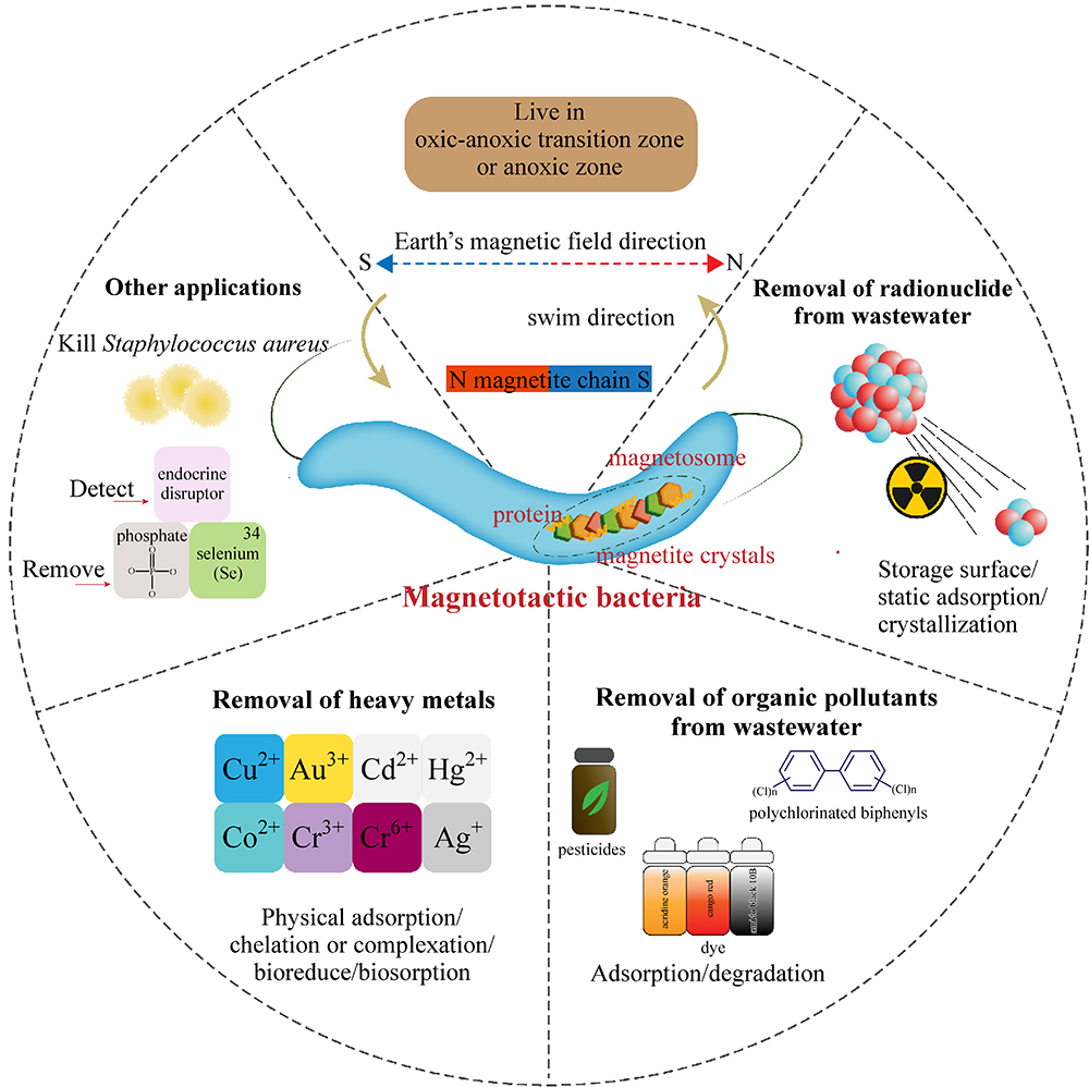 Magnetotactic bacteria (MTB) are a group of Gram-negative prokaryotes that respond to the geomagnetic field. This unique property is attributed to the intracellular magnetosomes, which contains membrane-bound nanocrystals of magnetic iron minerals. This review summarizes the most recent advances in MTB, magnetosomes, and their potential applications especially the environmental pollutant control or remediation. The morphologic and phylogenetic diversity of MTB were first introduced, followed by a critical review of isolation and cultivation methods. Past research has devoted to optimize the factors, such as oxygen, carbon source, nitrogen source, nutrient broth, iron source, and mineral elements for the growth of MTB. Besides the applications of MTB in modern biological and medical fields, little attention was made on the environmental applications of MTB for wastewater treatment, which has been summarized in this review. For example, applications of MTB as adsorbents have resulted in a novel magnetic separation technology for removal of heavy metals or organic pollutants in wastewater. In addition, we summarized the current advance on pathogen removal and detection of endocrine disruptor which can inspire new insights toward sustainable engineering and practices. Finally, the new perspectives and possible directions for future studies are recommended, such as isolation of MTB, genetic modification of MTB for mass production and new environmental applications. The ultimate objective of this review is to promote the applications of MTB and magnetosomes in the environmental fields.