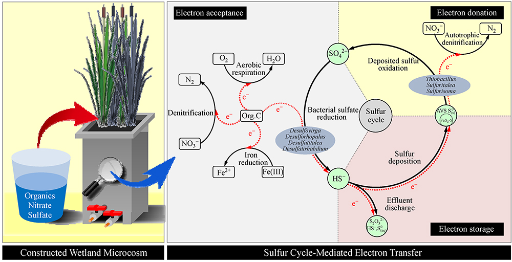 A constructed wetland microcosm was employed to investigate the sulfur cycle-mediated electron transfer between carbon and nitrate. Sulfate accepted electrons from organics at the average rate of 0.84 mol/(m3·d) through sulfate reduction, which accounted for 20.0% of the electron input rate. The remainder of the electrons derived from organics were accepted by dissolved oxygen (2.6%), nitrate (26.8%), and iron(III) (39.9%). The sulfide produced from sulfate reduction was transformed into acid-volatile sulfide, pyrite, and elemental sulfur, which were deposited in the substratum, storing electrons in the microcosm at the average rate of 0.52 mol/(m3·d). In the presence of nitrate, the acid-volatile and elemental sulfur were oxidized to sulfate, donating electrons at the average rate of 0.14 mol/(m3·d) and driving autotrophic denitrification at the average rate of 0.30 g N/(m3·d). The overall electron transfer efficiency of the sulfur cycle for autotrophic denitrification was 15.3%. A mass balance assessment indicated that approximately 50% of the input sulfur was discharged from the microcosm, and the remainder was removed through deposition (49%) and plant uptake (1%). Dominant sulfate-reducing (i.e., Desulfovirga, Desulforhopalus, Desulfatitalea, and Desulfatirhabdium) and sulfur-oxidizing bacteria (i.e., Thiohalobacter, Thiobacillus, Sulfuritalea, and Sulfurisoma), which jointly fulfilled a sustainable sulfur cycle, were identified. These results improved understanding of electron transfers among carbon, nitrogen, and sulfur cycles in constructed wetlands, and are of engineering significance.