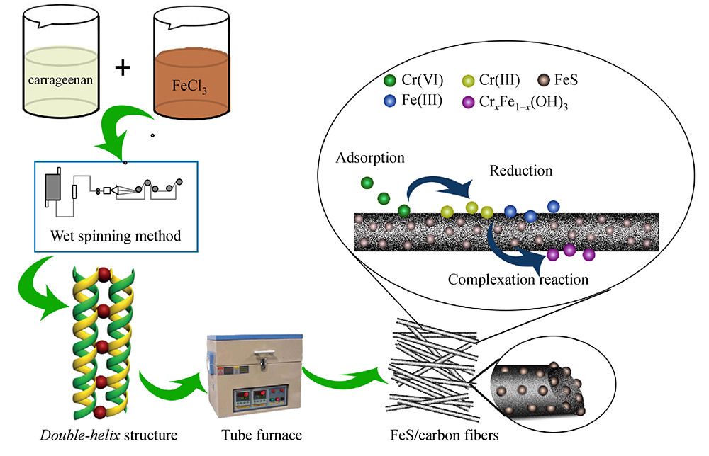 • FeS/carbon fibers were in situ synthesized with Fe-carrageenan hydrogel fiber. • The double helix structure of carrageenan is used to load and disperse Fe. • Pyrolyzing sulfate groups enriched carrageenan-Fe could easily generate FeS. • The adsorption mechanisms include reduction and complexation reaction.