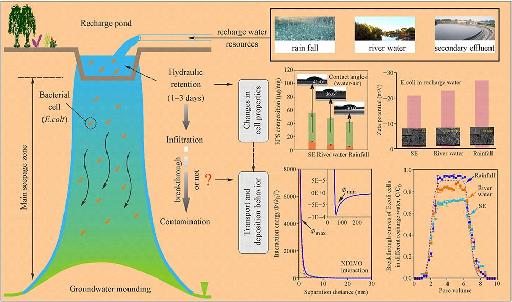Commonly used recharge water resources for artificial groundwater recharge (AGR) such as secondary effluent (SE), river water and rainfall, are all oligotrophic, with low ionic strengths and different cationic compositions. The dwelling process in recharge pond imposed physiologic stress on Escherichia coli (E. coli) cells, in all three types of investigated recharge water resources and the cultivation of E. coli under varying recharge water conditions, induced changes in cell properties. During adaptation to the recharge water environment, the zeta potential of cells became more negative, the hydrodynamic diameters, extracellular polymeric substances content and surface hydrophobicity decreased, while the cellular outer membrane protein profiles became more diverse. The mobility of cells altered in accordance with changes in these cell properties. The E. coli cells in rainfall recharge water displayed the highest mobility (least retention), followed by cells in river water and finally SE cells, which had the lowest mobility. Simulated column experiments and quantitative modeling confirmed that the cellular properties, driven by the physiologic state of cells in different recharge water matrices and the solution chemistry, exerted synergistic effects on cell transport behavior. The findings of this study contribute to an improved understanding of E. coli transport in actual AGR scenarios and prediction of spreading risk in different recharge water sources.
