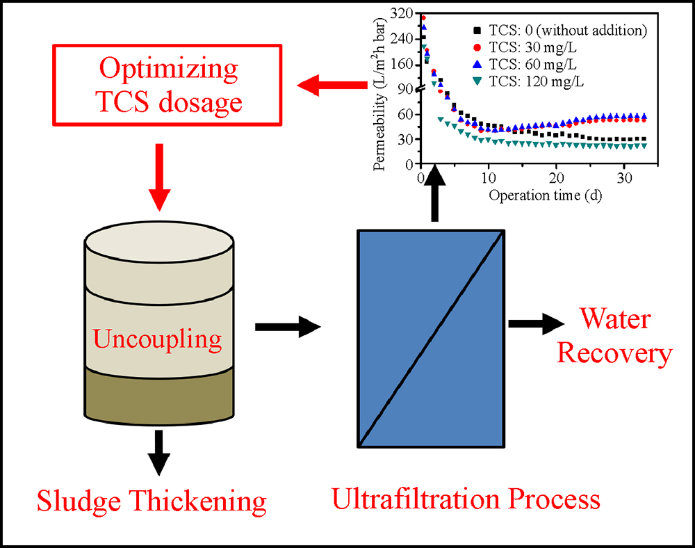 Energy uncoupling is often used for sludge reduction because it is easy to operate and does not require a significant amount of extra equipments (i.e. no additional tank required). However, over time the supernatant extracted using this method can deteriorate, ultimately requiring further treatment. The purpose of this study was to determine the effect of using a low-pressure ultrafiltration membrane process for sludge water recovery after the sludge had undergone an energy uncoupling treatment (using 3,3′,4′,5-tetrachlorosalicylanilide (TCS)). Energy uncoupling was found to break apart sludge floc by reducing extracellular polymeric substances (EPS) and adenosine triphosphate (ATP) content. Analysis of supernatant indicated that when energy uncoupling and membrane filtration were co-applied and the TCS dosage was below 30 mg/L, there was no significant deterioration in organic component removal. However, ammonia and phosphate concentrations were found to increase as the concentration of TCS added increased. Additionally, due to low sludge concentrations and EPS contents, addition of 30–60 mg/L TCS during sludge reduction increased the permeate flux (two times higher than the control) and decreased the hydraulic reversible and cake layer resistances. In contrast, high dosage of TCS aggravated membrane fouling by forming compact fouling layers. In general, this study found that the co-application of energy uncoupling and membrane filtration processes represents an effective alternative method for simultaneous sludge reduction and sludge supernatant recovery.