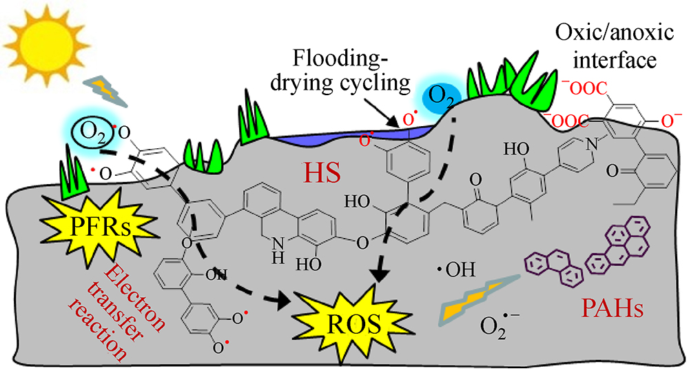 The role of humic substance-associated persistent free radicals (PFRs) in the fate of organic contaminants under various redox conditions remains unknown. This study examined the characterization of original metal-free peat humin (HM), and HM treated with varying concentrations of H2O2 and L-ascorbic acid (VC) (assigned as H2O2-HM and VC-HM). The concentration of PFRs in HM increased with the addition of VC/H2O2 at concentrations less than 0.08 M. The evolution of PFRs in HM under different environmental conditions (e.g., oxic/anoxic and humidity) was investigated. Two types of PFRs were detected in HM: a relatively stable radical existed in the original sample, and the other type, which was generated by redox treatments, was relatively unstable. The spin densities of VC/H2O2-HM readily returned to the original value under relatively high humidity and oxic conditions. During this process, the HM-associated “unstable” free radicals released an electron to O2, inducing the formation of reactive oxygen species (ROS, i.e., •OH and •O2−). The generated ROS promoted the degradation of polycyclic aromatic hydrocarbons based on the radical quenching measurements. The transformation rates followed the order naphthalene>phenanthrene>anthracene>benzo[a]pyrene. Our results provide valuable insight into the HM-induced transformation of organic contaminants under natural conditions.