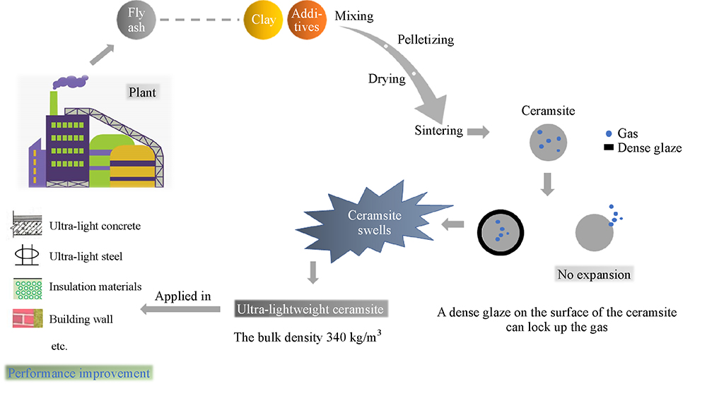 The disposal of fly ash has become a serious problem in China due to its rapid increase in volume in recent years. The most common method of fly ash disposal is solidification-stabilization-landfill, and the most common reuse is low-value-added building materials. A novel processing method for preparing ultra-lightweight ceramsite with fly ash was developed. The results show that the optimal parameters for preparation of ultra-lightweight ceramsite are as follows: mass ratio of fly ash:kaolin:diatomite= 80:15:5, preheating temperature of 800°C, preheating time of 5 min, sintering temperature of 1220°C, and sintering time of 10 min. The expansion agent is perlite, at 10 wt.% addition. Finally, a ceramsite with bulk density of 340 kg/m3, particle density of 0.68 g/cm3, and cylinder compressive strength of 1.02 MPa was obtained. Because of its low density and high porosity, ultra-lightweight ceramsite has excellent thermal insulation performance, and its strength is generally low, so it is usually used in the production of thermal insulation concrete and its products. The formation of a liquid-phase component on the surface, and generation of a gas phase inside ceramsite during the sintering process, make it possible to control the production of the suitable liquid phase and gas in this system, resulting in an optimization of the expansion behavior and microstructure of ceramsite. These characteristics show the feasibility of industrial applications of fly ash for the production of ultra-lightweight ceramsite, which could not only produce economic benefits, but also conserve land resources and protect the environment.