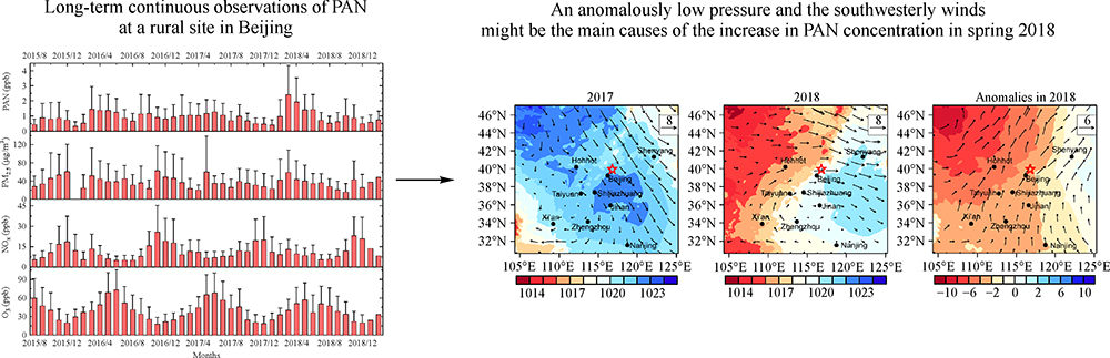 Peroxyacetyl nitrate (PAN) is one of the most important photochemical pollutants and has aroused much concern in China in recent decades. However, few studies described the long-term variations in PAN in China. In this study, we continuously monitored the PAN, O3 and NOx concentrations at a regional background site near Beijing from August 2015 to February 2019. Based on the observed concentrations and climate data, we analyzed the seasonal PAN variations. The results revealed that the monthly mean PAN concentration ranged from 0.33–2.41 ppb, with an average value of 0.94 ppb. The PAN concentration exhibited a distinct seasonal variation, with high values in spring and low values in winter. After analyzing the corresponding meteorological data, we found that stronger ultraviolet (UV) radiation, a relatively longer lifetime and a higher background PAN concentration contributed to the high PAN concentrations in spring. In addition, with the utilization of the WRF-Chem (Weather Research and Forecasting with Chemistry) model, the cause of the extremely high PAN concentration in spring 2018 was determined. The model results demonstrated that an anomalously low pressure and the southwesterly winds in northern China might be the main causes of the increased PAN concentration in Beijing and its surrounding area in spring 2018.