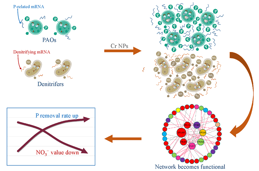 The objectives of this study were to investigate the influence of chromium nanoparticles (Cr NPs) on the nitrogen and phosphorus removal performance and the bacterial structures of an activated sludge (AS) system. Also, we through molecular ecological networks (MENs) discussed the bacterial interactions. At last we researched the change of the functional genes and their expression patterns related to nitrogen and phosphorus removal in an AS system. The results showed that long-term exposure to 1 mg/L Cr NPs significantly promoted the denitrifying process and phosphorus removal in the AS system. The relative abundance of denitrifying and phosphorus removal microorganisms, such as Denitratisoma, Thauera, Dechloromonas, and Defluviicoccus, increased significantly. Candidatus Accumulibacter, well-known as polyphosphate-accumulating organisms (PAOs), increased significantly; the relative abundance of Candidatus Competibacter, known as glycogen-accumulating organisms (GAOs), decreased significantly. Furthermore, metagenomic and metatranscriptomic analysis revealed that most of the genera related to denitrifying and phosphorus removal had greatly increased, according to the quantities of denitrifying and phosphorus genes, and the corresponding transcription likewise greatly increased. Lastly, MENs analysis showed that although the overall network became smaller and looser in the presence of Cr NPs, the microbial connections among members related to nitrogen and phosphorus removal were enhanced. The abundance increases of denitrifiers and PAOs, and their increased transcription of functional genes, together with the enhanced interactions may be associated with the promotion of the denitrifying process and phosphorus removal.