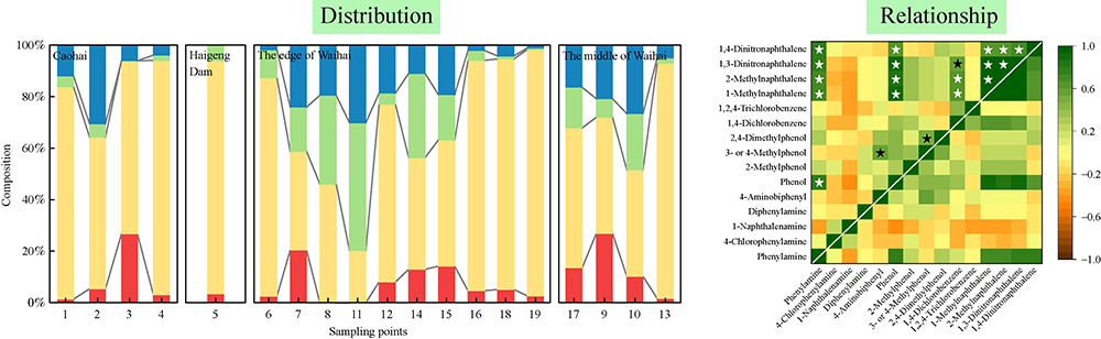 Organic pollutants are widespread environmental pollutants with high toxicity, persistence, and bioaccumulation. Our aim was to investigate the distribution of aromatic amines, phenols, chlorobenzenes, and naphthalenes in the surface sediment of the Dianchi Lake, China. Nineteen surface sediment samples were collected from the Dianchi Lake, and 40 types of organic pollutants were analyzed via gas chromatography–mass spectrometry. The total organic pollutant concentrations in the surface sediment of the Dianchi Lake varied from 27.4 to 1.62 × 103 ng/g. The concentrations of phenols were much higher than those in other water bodies but still within a controllable range, whereas the concentrations of the other organic pollutant classes were similar or even lower. The detection ratio of 3- or 4-methylphenol was the highest (100.00%) among the pollutants. The average total organic pollutant concentrations decreased in the following order: Caohai (540 ng/g)>the middle of Waihai (488 ng/g)>the edge of Waihai (351 ng/g)>Haigeng Dam (90.4 ng/g). Pearson analysis showed a strong correlation among 1-methylnaphthalene, 2-methylnaphthalene, 1,3-dinitronaphthalene, and 1,4-dinitronaphthalene (p<0.01). Caohai, the north lakeshore of Waihai and the south of Waihai showed higher risk because of high concentration; meanwhile, 1,4-dichlorobenzene, 3- or 4-methylphenol and 1,2,4-trichlorobenzene were more likely to cause risks.