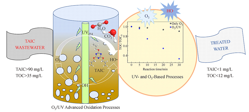 Triallyl isocyanurate (TAIC, C12H15N3O3) has featured in wastewater treatment as a refractory organic compound due to the significant production capability and negative environmental impact. TAIC degradation was enhanced when an ozone(O3)/ultraviolet(UV) process was applied compared with the application of an independent O3 process. Although 99% of TAIC could be degraded in 5 min during both processes, the O3/UV process had a 70%mineralization rate that was much higher than that of the independent O3 process (9%) in 30 min. Four possible degradation pathways were proposed based on the organic compounds of intermediate products identified during TAIC degradation through the application of independent O3 and O3/UV processes. pH impacted both the direct and indirect oxidation processes. Acidic and alkaline conditions preferred direct and indirect reactions respectively, with a pH of 9 achieving maximum Total Organic Carbon (TOC) removal. Both CO32– and HCO3– decreased TOC removal, however only CO32– negatively impacted TAIC degradation. Effects of Cl– as a radical scavenger became more marked only at high concentrations (over 500 mg/L Cl–). Particulate and suspended matter could hinder the transmission of ultraviolet light and reduce the production of HO· accordingly.