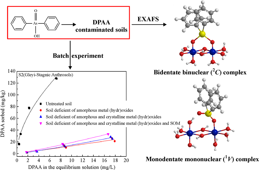 Diphenylarsinic acid (DPAA) is a phenyl arsenic compound derived from chemical warfare weapons. Macroscopic and microscopic work on DPAA sorption will provide useful information in predicting the partitioning and mobility of DPAA in the soil-water environment. Here, batch experiments and extended X-ray absorption fine structure (EXAFS) spectroscopy were used to investigate the sorption mechanisms of DPAA. The DPAA sorption data from 11 soil types was found to fit the Freundlich equation, and the sorption capacity, Kf, was significantly and positively correlated with oxalate-extractable Fe2O3. The Kf values of eight of the 11 untreated soils (1.51–113.04) significantly decreased upon removal of amorphous metal (hydr)oxides (0.51–13.37). When both amorphous and crystalline metal (hydr)oxides were removed from the untreated soils, the Kf values either decreased or slightly increased (0.65–3.09). Subsequent removal of soil organic matter from these amorphous and crystalline metal (hydr)oxide-depleted samples led to further decreases in Kf to 0.02–1.38, with only one exception (Sulfic Aquic-Orthic Halosols). These findings strongly suggest that ligand exchange reactions with amorphous metal (hydr)oxides contribute most to DPAA sorption on soils. EXAFS data provide further evidence that DPAA primarily formed bidentate binuclear (2C) and monodentate mononuclear (1V) coring-sharing complexes with As-Fe distances of 3.34 and 3.66 Å, respectively, on Fe (hydr)oxides. Comparison of these results with earlier studies suggests that 2C and 1V complexes of DPAA may be favored under low and high surface coverages, respectively, with the formation of 1V bonds possibly conserving the sorption sites or decreasing the steric hindrance derived from phenyl substituents.