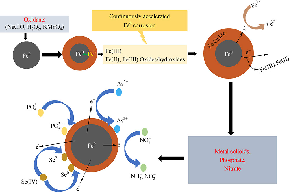 Zero-valent iron (ZVI) technology has recently gained significant interest in the efficient sequestration of a wide variety of contaminants. However, surface passivation of ZVI because of its intrinsic passive layer would lead to the inferior reactivity of ZVI and its lower efficacy in contaminant removal. Therefore, to activate the ZVI surface cheaply, continuously, and efficiently is an important challenge that ZVI technology must overcome before its wide-scale application. To date, several physical and chemical approaches have been extensively applied to increase the reactivity of the ZVI surface toward the elimination of broad-spectrum pollutants. Nevertheless, these techniques have several limitations such as low efficacy, narrow working pH, eco-toxicity, and high installation cost. The objective of this mini-review paper is to identify the critical role of oxygen in determining the reactivity of ZVI toward contaminant removal. Subsequently, the effect of three typical oxidants (H2O2, KMnO4, and NaClO) on broad-spectrum contaminants removal by ZVI has been documented and discussed. The reaction mechanism and sequestration efficacies of the ZVI/oxidant system were evaluated and reviewed. The technical basis of the ZVI/oxidant approach is based on the half-reaction of the cathodic reduction of the oxidants. The oxidants commonly used in the water treatment industry, i.e., NaClO, O3, and H2O2, can be served as an ideal coupling electron receptor. With the combination of these oxidants, the surface corrosion of ZVI can be continuously driven. The ZVI/oxidants technology has been compared with other conventional technologies and conclusions have been drawn.