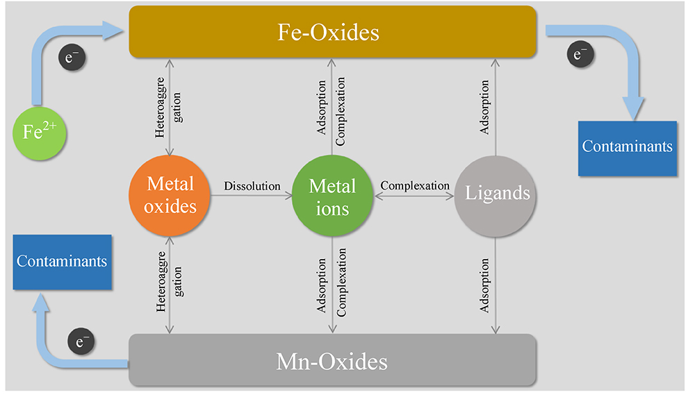 Conspectus Redox reactions of Fe- and Mn-oxides play important roles in the fate and transformation of many contaminants in natural environments. Due to experimental and analytical challenges associated with complex environments, there has been a limited understanding of the reaction kinetics and mechanisms in actual environmental systems, and most of the studies so far have only focused on simple model systems. To bridge the gap between simple model systems and complex environmental systems, it is necessary to increase the complexity of model systems and examine both the involved interaction mechanisms and how the interactions affected contaminant transformation. In this Account, we primarily focused on (1) the oxidative reactivity of Mn- and Fe-oxides and (2) the reductive reactivity of Fe(II)/iron oxides in complex model systems toward contaminant degradation. The effects of common metal ions such as Mn2+ , Ca2+, Ni2+, Cr3+ and Cu2+, ligands such as small anionic ligands and natural organic matter (NOM), and second metal oxides such as Al, Si and Ti oxides on the redox reactivity of the systems are briefly summarized.