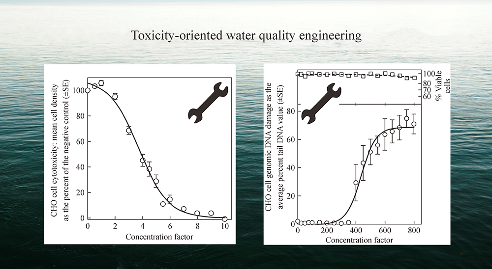 The fundamental goal of water quality engineering is to ensure water safety to humans and the environment. Traditional water quality engineering consists of monitoring, evaluation, and control of key water quality parameters. This approach provides some vital insights into water quality, however, most of these parameters do not account for pollutant mixtures – a reality that terminal water users face, nor do most of these parameters have a direct connection with the human health safety of waters. This puts the real health-specific effects of targeted water pollutant monitoring and engineering control in question. To focus our attention to one of the original goals of water quality engineering – human health and environmental protection, we advocate here the toxicity-oriented water quality monitoring and control. This article presents some of our efforts toward such goal. Specifically, complementary to traditional water quality parameters, we evaluated the water toxicity using high sensitivity toxicological endpoints, and subsequently investigated the performance of some of the water treatment strategies in modulating the water toxicity. Moreover, we implemented the toxicity concept into existing water treatment design theory to facilitate toxicity-oriented water quality control designs. Suggestions for the next steps are also discussed. We hope our work will intrigue water quality scientists and engineers to improve and embrace the mixture water pollutant and toxicological evaluation and engineering control.