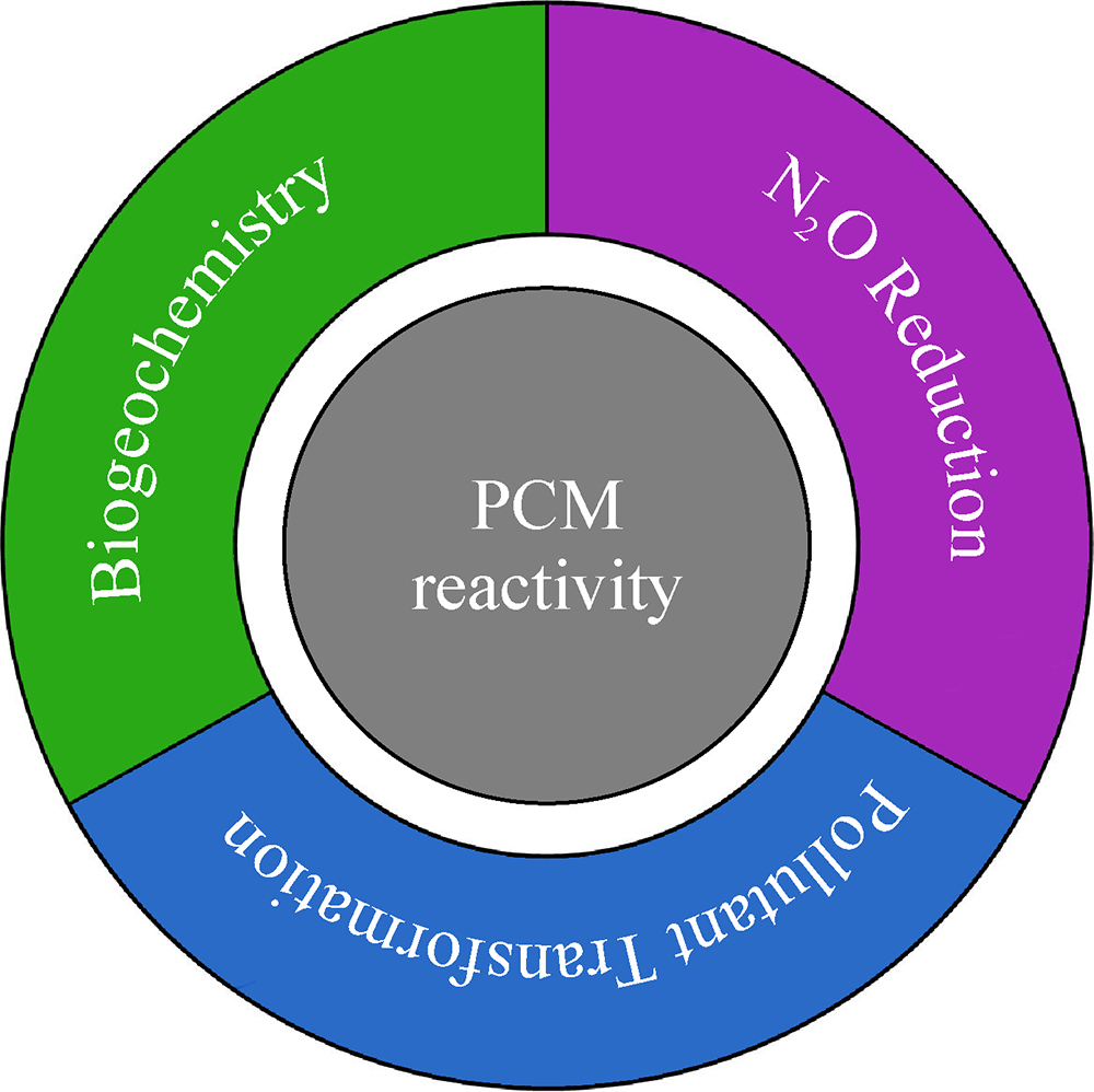 Pyrogenic Carbonaceous matter (PCM; e.g., black carbon, biochar, and activated carbon) are solid residues from incomplete combustion of fossil fuel or biomass. They are traditionally viewed as inert adsorbents for sequestering contaminants from the aqueous phase or providing surfaces for microbes to grow. In this account, we reviewed the recently discovered reactivity of PCM in promoting both chemical and microbial synergies that are important in pollutant transformation, biogeochemical processes of redox-active elements, and climate change mitigation with respect to the interaction between biochar and nitrous oxide (N2O). Moreover, we focused on our group’s work in the PCM-enhanced abiotic transformation of nitrogenous and halogenated pollutants and conducted in-depth analysis of the reaction pathways. To understand what properties of PCM confer its reactivity, our group pioneered the use of PCM-like polymers, namely conjugated microporous polymers (CMPs), to mimic the performance of PCM. This approach allows for the controlled incorporation of specific surface properties (e.g., quinones) into the polymer network during the polymer synthesis. As a result, the relationship between specific characteristics of PCM and its reactivity in facilitating the decay of a model pollutant was systematically studied in our group’s work. The findings summarized in this account help us to better understand an overlooked environmental process where PCM synergistically interacts with various environmental reagents such as hydrogen sulfide and water. Moreover, the knowledge gained in these studies could inform the design of a new generation of reactive carbonaceous materials with tailored properties that are highly efficient in contaminant removal.
