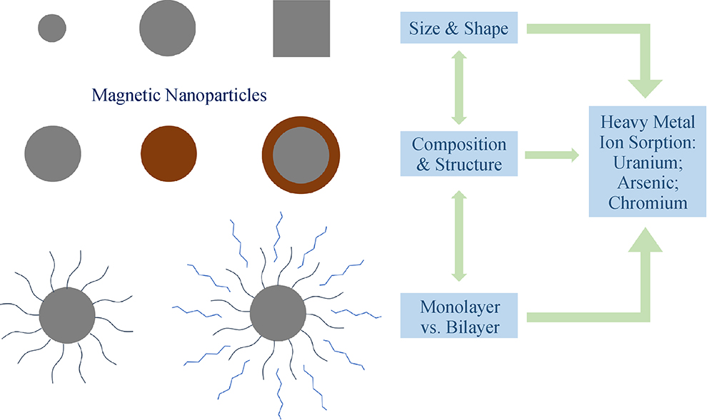 • The fabrication of monodisperse, (super)paramagnetic nanoparticles is summarized. • Monolayer and bilayer surface coating structures are described. • Mono/bilayer coated nanoparticles showed high sorption capacities for U, As, and Cr.