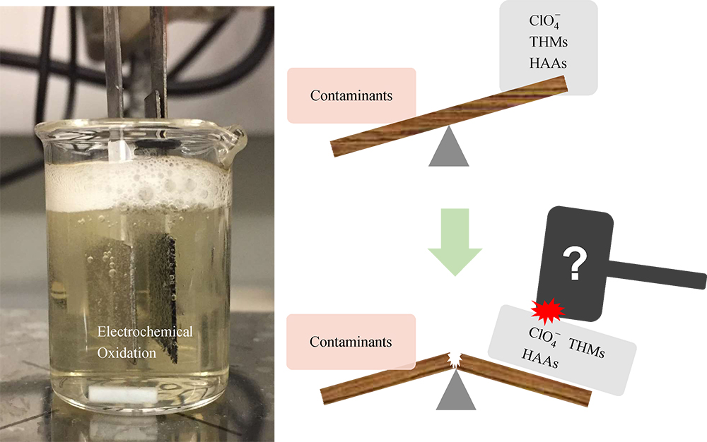 Electrochemical oxidation (EO) is a promising technique for decentralized wastewater treatment, owing to its modular design, high efficiency, and ease of automation and transportation. The catalytic destruction of recalcitrant, non-biodegradable pollutants (per- and poly-fluoroalkyl substances (PFAS), pharmaceuticals, and personal care products (PPCPs), pesticides, etc.) is an appropriate niche for EO. EO can be more effective than homogeneous advanced oxidation processes for the degradation of recalcitrant chemicals inert to radical-mediated oxidation, because the potential of the anode can be made much higher than that of hydroxyl radicals (EOH = 2.7 V vs. NHE), forcing the direct transfer of electrons from pollutants to electrodes. Unfortunately, at such high anodic potential, chloride ions, which are ubiquitous in natural water systems, will be readily oxidized to chlorine and perchlorate. Perchlorate is a to-be-regulated byproduct, and chlorine can react with matrix organics to produce organic halogen compounds. In the past ten years, novel electrode materials and processes have been developed. However, spotlights were rarely focused on the control of byproduct formation during EO processes in a real-world context. When we use EO techniques to eliminate target contaminants with concentrations at μg/L-levels, byproducts at mg/L-levels might be produced. Is it a good trade-off? Is it possible to inhibit byproduct formation without compromising the performance of EO? In this mini-review, we will summarize the recent advances and provide perspectives to address the above questions.