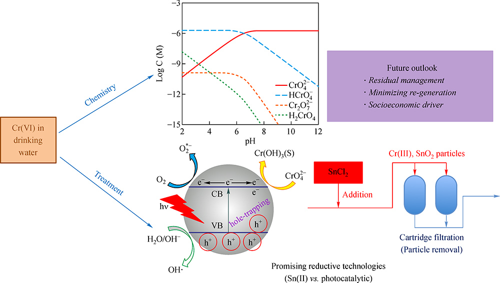 Chromium (Cr) typically exists in either trivalent and hexavalent oxidation states in drinking water, i.e., Cr(III) and Cr(VI), with Cr(VI) of particular concern in recent years due to its high toxicity and new regulatory standards. This Account presented a critical analysis of the sources and occurrence of Cr(VI) in drinking water in the United States, analyzed the equilibrium chemistry of Cr(VI) species, summarized important redox reaction relevant to the fate of Cr(VI) in drinking water, and critically reviewed emerging Cr(VI) treatment technologies. There is a wide occurrence of Cr(VI) in US source drinking water, with a strong dependence on groundwater sources, mainly due to naturally weathering of chromium-containing aquifers. Challenges regarding traditional Cr(VI) treatment include chemical cost, generation of secondary waste and inadvertent re-generation of Cr(VI) after treatment. To overcome these challenges, reductive Cr(VI) treatment technologies based on the application of stannous tin or electron-releasing titanium dioxide photocatalyst hold extreme promise in the future. To moving forward in the right direction, three key questions need further exploration for the technology implementation, including effective management of residual waste, minimizing the risks of Cr(VI) re-occurrence downstream of drinking water treatment plant, and promote the socioeconomic drivers for Cr(VI) control in the future.