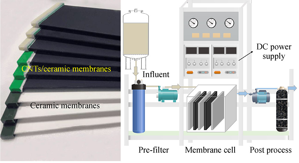 Ultrafiltration is employed as an important process for water treatment and reuse, which is of great significance to alleviate the shortage of water resources. However, it suffers from severe membrane fouling and the trade-off between selectivity and permeability. In this work, a CNTs/ceramic flat sheet ultrafiltration membrane coupled with electro-assistance was developed for improving the antifouling and separation performance. The CNTs/ceramic flat sheet membrane was fabricated by coating cross-linked CNTs on ceramic membrane, featuring a good electroconductivity of 764.75 S/m. In the filtration of natural water, the permeate flux of the membrane with the cell voltage of -2.0 V was 1.8 times higher than that of the membrane without electro-assistance and 5.7-fold greater than that of the PVDF commercial membrane. Benefiting from the electro-assistance, the removal efficiency of the typical antibiotics was improved by 50%. Furthermore, the electro-assisted membrane filtration process showed 70% reduction in energy consumption compared with the filtration process of the commercial membrane. This work offers a feasible approach for membrane fouling mitigation and effluent quality improvement and suggests that the electro-assisted CNTs/ceramic membrane filtration process has great potential in the application of water treatment.