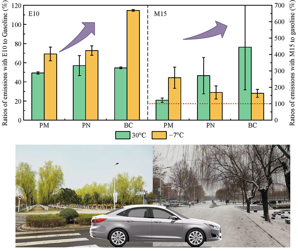 Ambient temperature has substantial impacts on vehicle emissions, but the impacts may differ between traditional and alcohol gasolines. The objective of this study was to investigate the effects of temperature on gaseous and particulate emissions with both traditional and alcohol gasoline. Regulated gaseous, particle mass (PM), particle number (PN) and black carbon (BC) emissions from typical passenger vehicles were separately quantified with gasoline, E10 (10% ethanol and 90% gasoline by volume) and M15 (15% methanol and 85% gasoline by volume) at both 30°C and -7°C. The particulate emissions with all fuels increased significantly with decreased temperature. The PM emissions with E10 were only 48.0%–50.7% of those with gasoline at 30°C but increased to 59.2%-79.4% at -7°C. The PM emissions with M15 were comparable to those with gasoline at 30°C, but at -7°C, the average PM emissions were higher than those with gasoline. The variation trend of PN emissions was similar to that of PM emissions with changes in the fuel and temperature. At 30°C, the BC emissions were lower with E10 and M15 than with gasoline in most cases, but E10 and M15 might emit more BC than gasoline at -7°C, especially M15. The results of the transient PN and BC emission rates show that particulate emissions were dominated mainly by those emitted during the cold-start moment. Overall, the particulate emissions with E10 and M15 were more easily affected by ambient temperature, and the advantages of E10 and M15 in controlling particulate emissions declined as the ambient temperature decreased.