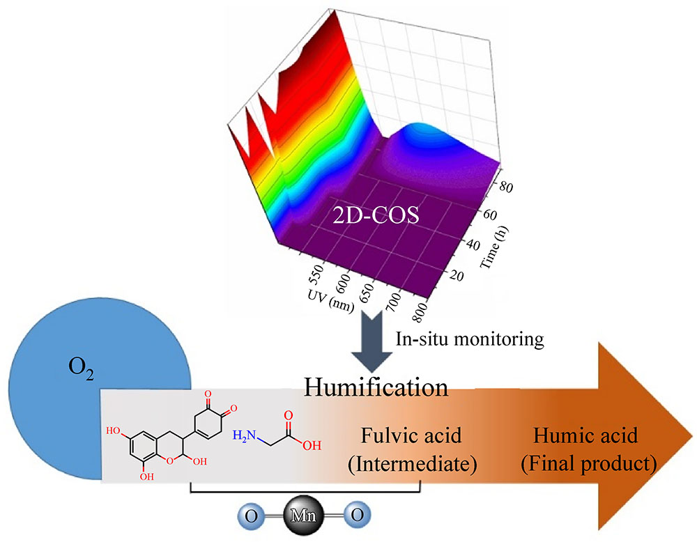 Abiotic humification is important in the formation and evolution of organic matter in soil and compost maturing processes. However, the roles of metal oxides in abiotic humification reactions under micro-aerobic remain ambiguous. The aim of this study was to use non-destructive measurement methods to investigate the role of MnO2 in the evolution of humic substances (HSs) during oxidative polymerization of polyphenol-amino acid. Our results suggested a synergistic effect between MnO2 and O2 in promoting the polymerization reaction and identified that MnO2 alone had a limited ability in accelerating the transformation of fulvic acid (FA) to humic acid (HA), whereas O2 was the key factor in the process. Two-dimensional correlation spectroscopy (2D-COS) showed that the evolution in the UV-vis spectra followed the order of 475–525 nm>300–400 nm>240–280 nm in the humification process, indicating the formation of simple organic matter followed by FA and then HA. 13C nuclear magnetic resonance (13C NMR) analysis revealed that the products under both air and N2 conditions in the presence of MnO2 had greater amounts of aromatic-C than in the absence of MnO2, demonstrating that MnO2 affected the structure of the humification products. The results of this study provided new insights into the theory of abiotic humification.