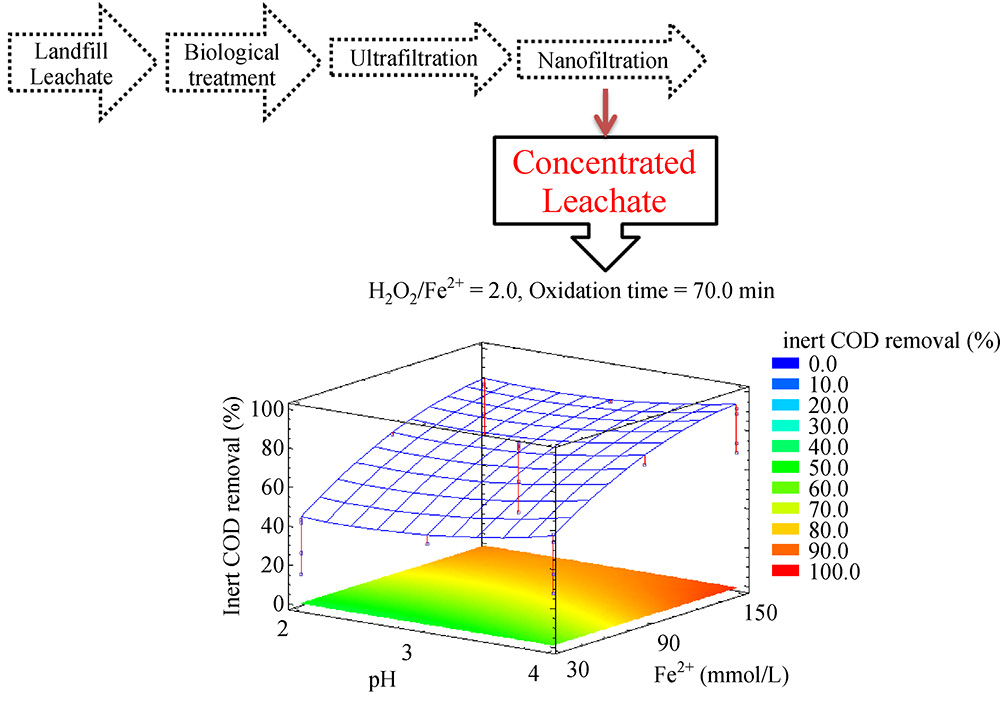 The primary aim of this study is inert COD removal from leachate nanofiltration concentrate because of its high concentration of resistant organic pollutants. Within this framework, this study focuses on the treatability of leachate nanofiltration concentrate through Fenton oxidation and optimization of process parameters to reach the maximum pollutant removal by using response surface methodology (RSM). Initial pH, Fe2+ concentration, H2O2/Fe2+ molar ratio and oxidation time are selected as the independent variables, whereas total COD, color, inert COD and UV254 removal are selected as the responses. According to the ANOVA results, the R2 values of all responses are found to be over 95%. Under the optimum conditions determined by the model (pH: 3.99, Fe2+: 150 mmol/L, H2O2/Fe2+: 3.27 and oxidation time: 84.8 min), the maximum COD removal efficiency is determined as 91.4% by the model. The color, inert COD and UV254 removal efficiencies are determined to be 99.9%, 97.2% and 99.5%, respectively, by the model, whereas the total COD, color, inert COD and UV254 removal efficiencies are found respectively to be 90%, 96.5%, 95.3% and 97.2%, experimentally under the optimum operating conditions. The Fenton process improves the biodegradability of the leachate NF concentrate, increasing the BOD5/COD ratio from the value of 0.04 to the value of 0.4. The operational cost of the process is calculated to be 0.238 €/g CODremoved. The results indicate that the Fenton oxidation process is an efficient and economical technology in improvement of the biological degradability of leachate nanofiltration concentrate and in removal of resistant organic pollutants.