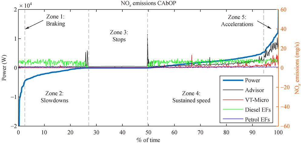 • New method named CAbOP is presented based on ordering data according to power. • Three emission models are used and their emission results compared. • Emissions data are analyzed in real driving cycles under CAbOP criteria. • Methodology to collect data and reconstruct lost data in real urban driving cycles.