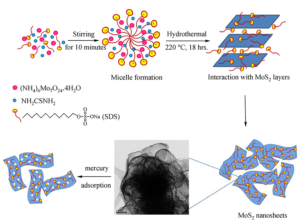 Recently, different nanomaterial-based adsorbents have received greater attention for the removal of environmental pollutants, specifically heavy metals from aqueous media. In this work, we synthesized few-layered MoS2 nanosheets via a surfactant-assisted hydrothermal method and utilized them as an efficient adsorbent for the removal of mercury from aqueous media. The synthesized MoS2 nanosheets showed petal-like morphology as confirmed by scanning electron microscope and high-resolution transmission electron microscopic analysis. The average thickness of the nanosheets is found to be about 57 nm. Possessing high stability and negative zeta potential makes this material suitable for efficient adsorption of mercury from aqueous media. The adsorption efficiency of the adsorbent was investigated as a function of pH, contact time and adsorbent dose. The kinetics of adsorption and reusability potential of the adsorbent were also performed. A pseudo-second-order kinetics for mercury adsorption was observed. As prepared MoS2 nanosheets showed 93% mercury removal efficiency, whereas regenerated adsorbent showed 91% and 79% removal efficiency in the respective 2nd and 3rd cycles. The adsorption capacity of the adsorbent was found to be 289 mg/g at room temperature.