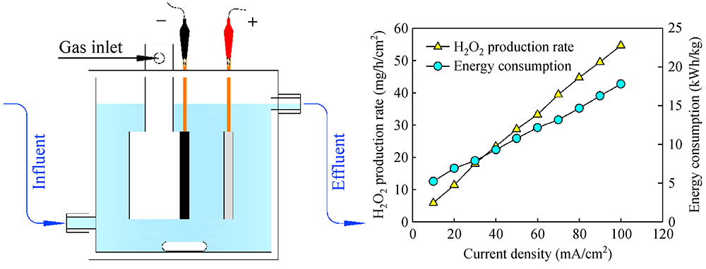 This study evaluated the feasibility of electrochemical hydrogen peroxide (H2O2) production with gas diffusion electrode (GDE) for decentralized water treatment. Carbon black-polytetrafluoroethylene GDEs were prepared and tested in a continuous flow electrochemical cell for H2O2 production from oxygen reduction. Results showed that because of the effective oxygen transfer in GDEs, the electrode maintained high apparent current efficiencies (ACEs,>80%) for H2O2 production over a wide current density range of 5–400 mA/cm2, and H2O2 production rates as high as ~202 mg/h/cm2 could be obtained. Long-term stability test showed that the GDE maintained high ACEs (>85%) and low energy consumption (<10 kWh/kg H2O2) for H2O2 production for 42 d (~1000 h). However, the ACEs then decreased to ~70% in the following 4 days because water flooding of GDE pores considerably impeded oxygen transport at the late stage of the trial. Based on an electrode lifetime of 46 days, the overall cost for H2O2 production was estimated to be ~0.88 $/kg H2O2, including an electricity cost of 0.61 $/kg and an electrode capital cost of 0.27 $/kg. With a 9 cm2 GDE and 40 mA/cm2 current density, ~2–4 mg/L of H2O2 could be produced on site for the electro-peroxone treatment of a 1.2 m3/d groundwater flow, which considerably enhanced ibuprofen abatement compared with ozonation alone (~43%–59% vs. 7%). These findings suggest that electrochemical H2O2 production with GDEs holds great promise for the development of compact treatment technologies for decentralized water treatment at a household and community level.