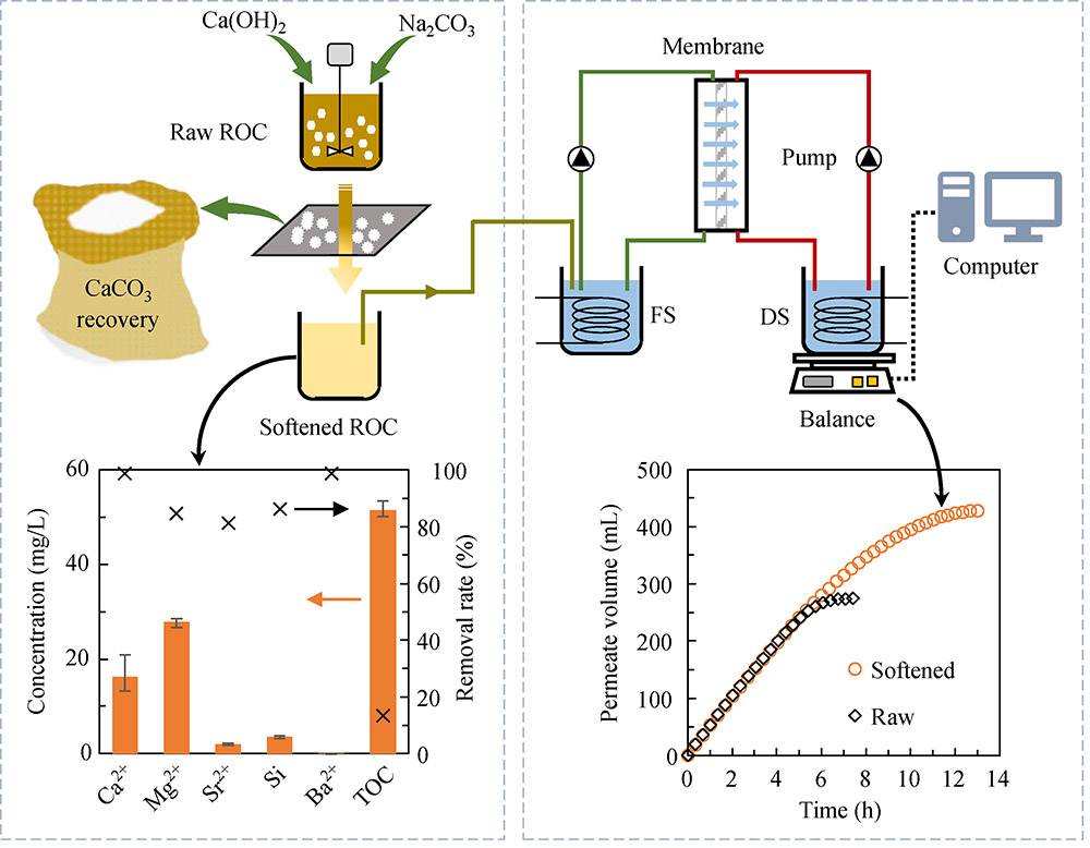 • Forward osmosis (FO) coupled with chemical softening for CCI ROC minimization • Effective removal of scale precursor ions by lime-soda ash softening • Enhanced water recovery from 54% to 86% by mitigation of FO membrane scaling • High-purity CaCO3 was recovered from the softening sludge • Membrane cleaning efficiency of 88.5% was obtained by EDTA for softened ROC