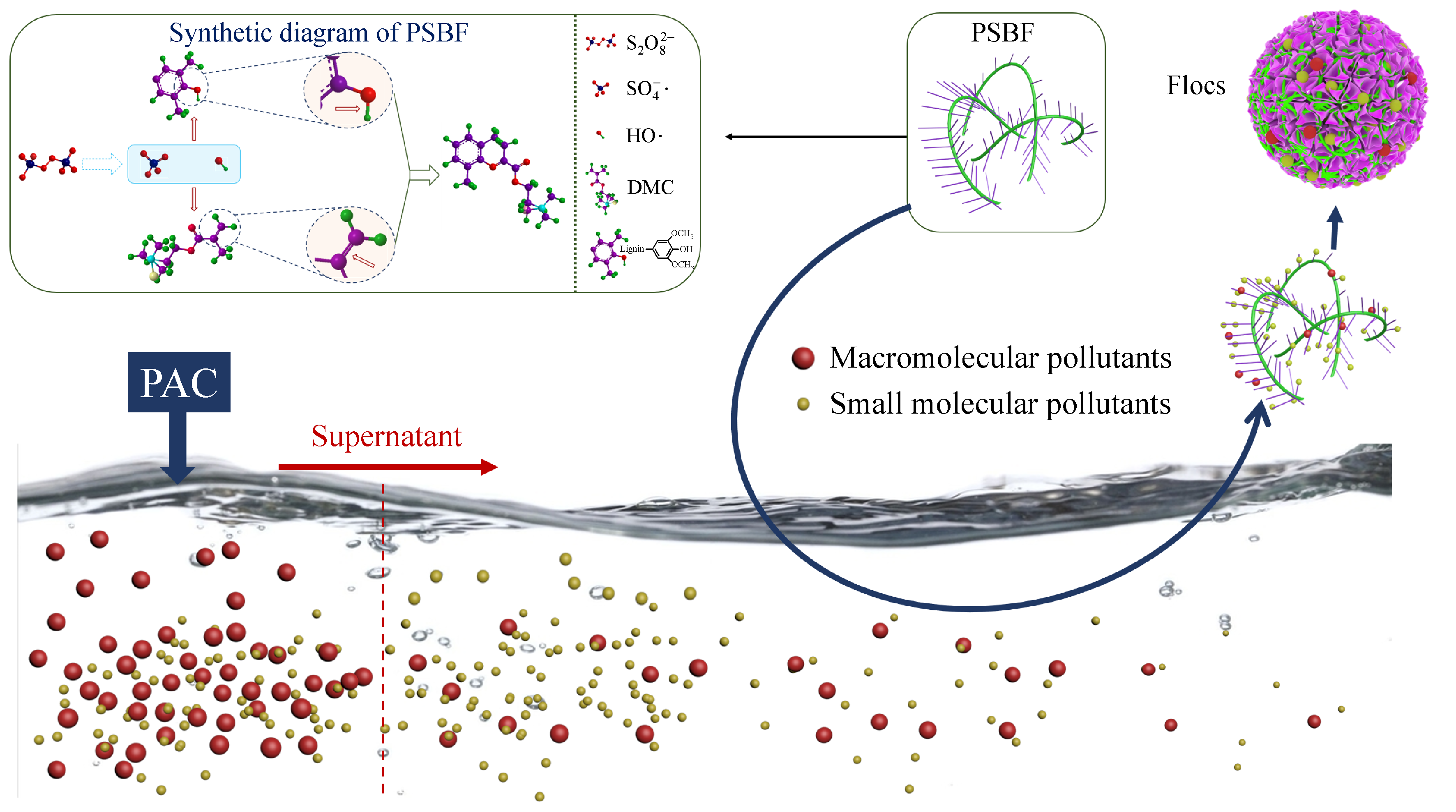 •PSBF performed better than PAC and PAM in CODCr removals. •PSBF was more insensitive to changing pH than PAC and PAM. •PAC could remove humic acid-like pollutants and dye particles. •PSBF was efficient in removing tryptophan-like pollutants from PPDW. •A secondary coagulation-flocculation process (PAC→PSBF) is proposed here.