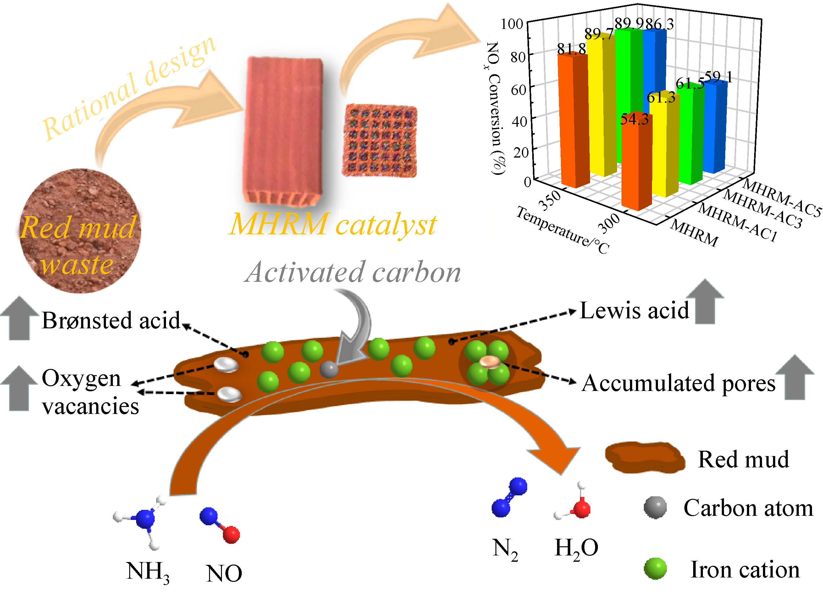 Our previous study proved that the acid-pretreatment process could efficiently activate red mud (RM) for the selective catalytic reduction (SCR) of NOx. However, in terms of the molding process, which is the key step determining whether it can be applied in large-scale industrial, the surface acidity and reducibility of catalyst always decreased dramatically, and part of surface area and pore structure were lost. In this study, we prepared monolithic honeycomb red mud (MHRM) catalysts with activated carbon (AC) as an accelerant and investigated the effect of AC on the MHRM. The results showed that the MHRM with 3 wt.% of AC (MHRM-AC3) exhibited the best SCR performance, and kept more than 80% NOx conversion in the range of 325°C–400°C. Compared with the MHRM, MHRM-AC1, and HMRM-AC5, the MHRM-AC3 has more mesoporous and macroporous structures, which can provide more adsorption active sites. The AC significantly improved NH3 adsorption and surface reducibility, which was mainly due to the increase of the surface acid sites (especially the Brönsted acid sites), the concentration of Fe(II), and the surface adsorbed oxygen. The presence of more Fe(II) enriched the surface oxygen vacancies, as well as the surface adsorbed oxygen, due to the charge imbalance and unsaturated chemical bond. And surface adsorbed oxygen exhibited more active than lattice oxygen owing to its higher mobility, which was conducive to NOx reduction in the SCR reaction.