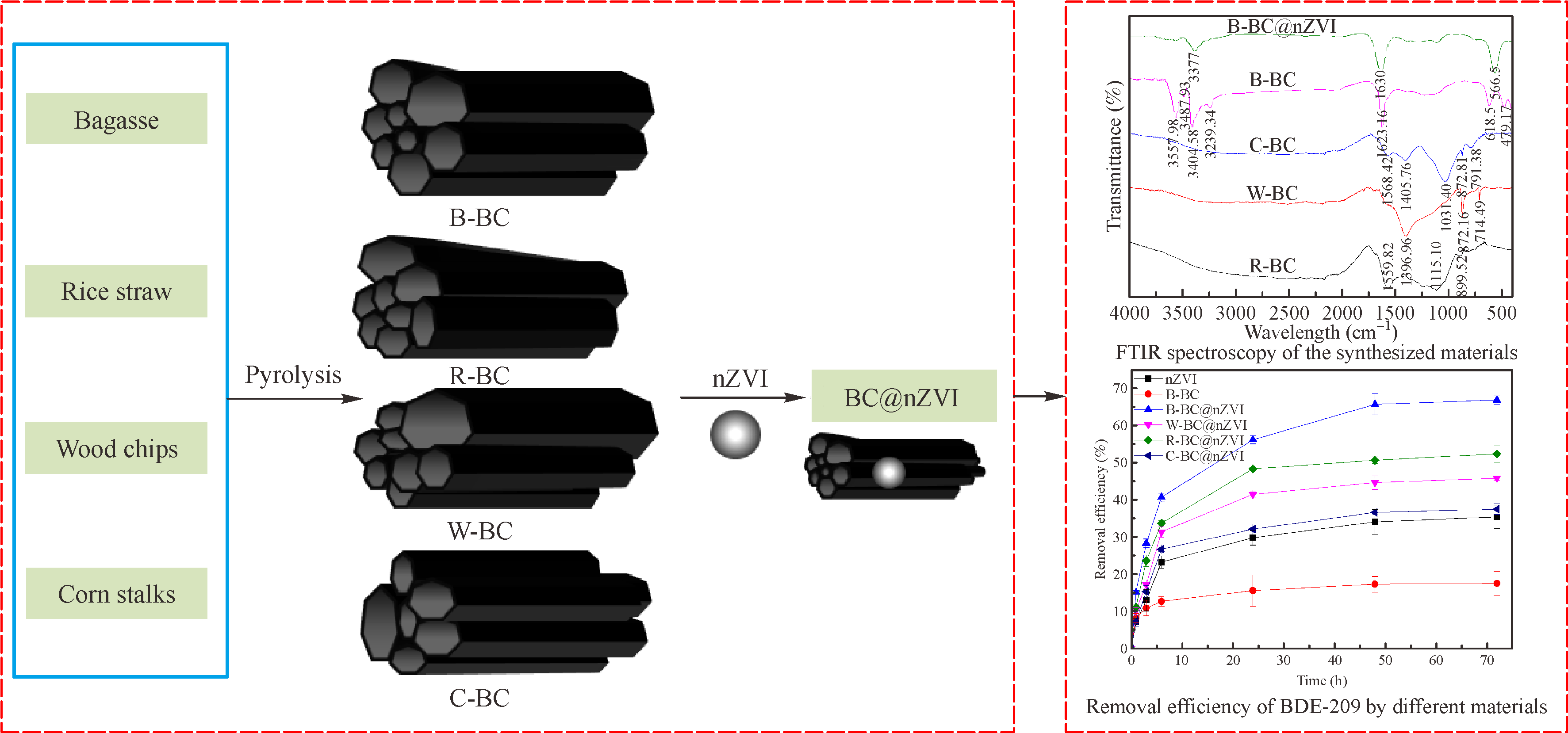 • Biochar enhanced the mobility and stability of zero-valent iron nanoparticles. • Particle performance was best when the BC:nZVI mass ratio was 1:1. • Bagasse-BC@nZVI removed 66.8% of BDE209.