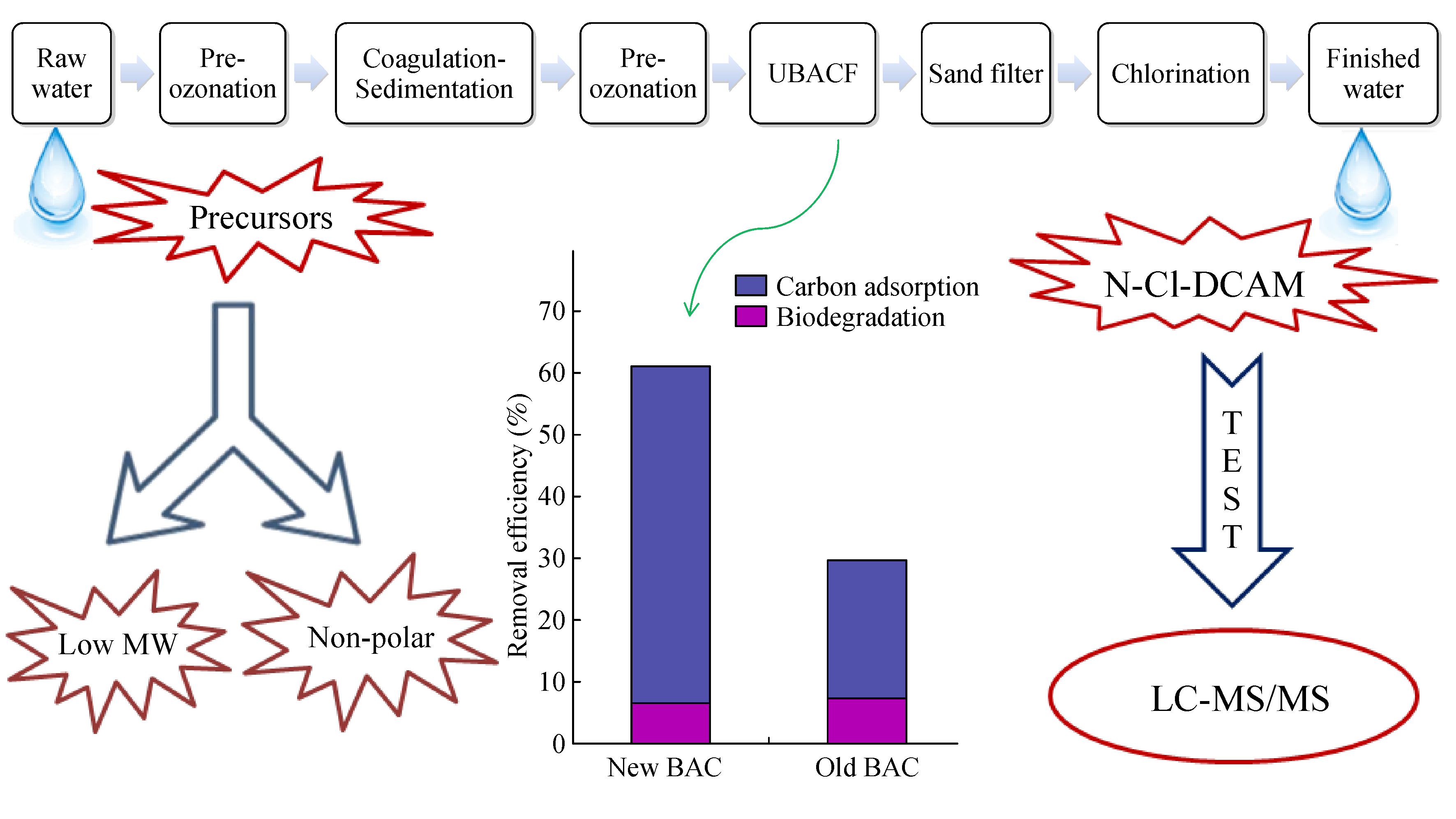 N-chloro-2,2-dichloroacetamide (N-Cl-DCAM) is an emerging nitrogenous disinfection by-product (N-DBP) which can occur in drinking water. In this study, an analytical method based on liquid chromatography with tandem mass spectrometry (LC-MS/MS) was developed to validate the concentration of N-Cl-DCAM, which was found to be 1.5 mg/L in the effluent of a waterworks receiving raw water from Taihu Lake, China. The changes of N-Cl-DCAM formation potential (N-Cl-DCAMFP) in the drinking water treatment process and the removal efficiency of its precursors in each unit were evaluated. Non-polar organics accounted for the majority of N-Cl-DCAM precursors, accounting for 70% of the N-Cl-DCAM FP. The effect of conventional water treatment processes on the removal of N-Cl-DCAM precursors was found to be unsatisfactory due to their poor performance in the removal of low molecular weight (MW) or non-polar organics. In the ozonation integrated with biological activated carbon (O3-BAC) process, the ozonation had little influence on the decrease of N-Cl-DCAM FP. The removal efficiency of precursors by a new BAC filter, in which the granular activated carbon (GAC) had only been used for four months was higher than that achieved by an old BAC filter in which the GAC had been used for two years. The different removal efficiencies of precursors were mainly due to the different adsorption capacities of GAC for individual precursors. Low MW or non-polar organics were predominantly removed by GAC, rather than biodegradation by microorganisms attached to GAC particles.