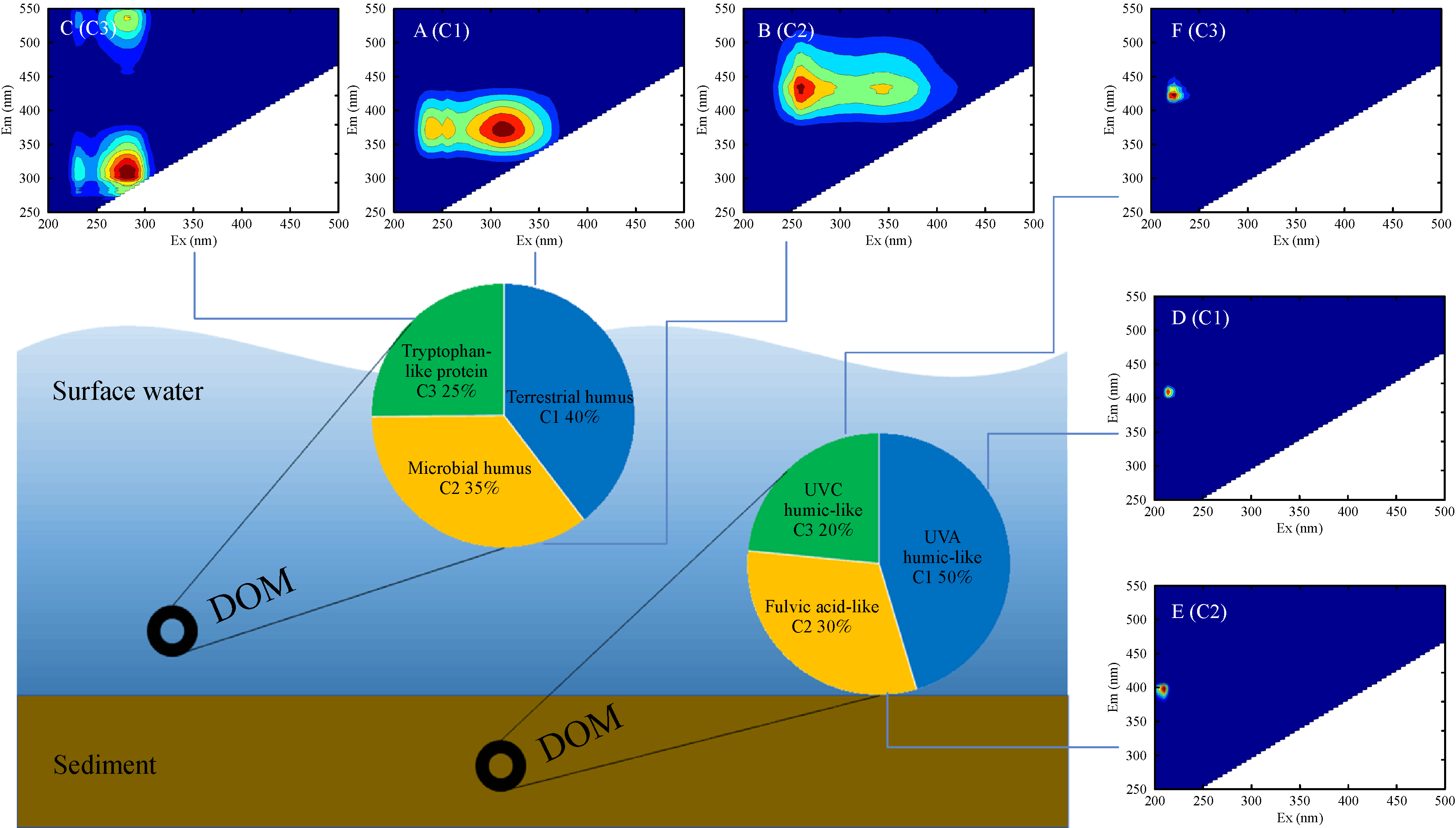 Dissolved organic matter (DOM) in rivers is a critical regulator of the cycling and toxicity of pollutants and the behavior of DOM is a key indicator for the health of the environment. We investigated the sources and characteristics of DOM in surface water and sediment samples of the Wei River, China. Dissolved organic carbon (DOC) concentration and ultraviolet absorbance at 254 nm (UV254) increased in the surface water and were decreased in the sediment downstream, indicating that the source of DOM in the water differed from the sediment. Parallel factor (PARAFAC) analysis of the excitation-emission matrices (EEM) revealed the presence of terrestrial humus-like, microbial humus-like and tryptophan-like proteins in the surface water, whereas the sediment contained UVA humic-like, UVC humic-like and fulvic-like in the sediment. The DOM in the surface water and sediment were mainly derived from microbial metabolic activity and the surrounding soil. Surface water DOM displayed greater photodegradation potential than sediment DOM. PARAFAC analysis indicated that the terrestrial humic-like substance in the water and the fulvic-like component in the sediment decomposed more rapidly. These data describe the characteristics of DOM in the Wei River and are crucial to understanding the fluctuations in environmental patterns.